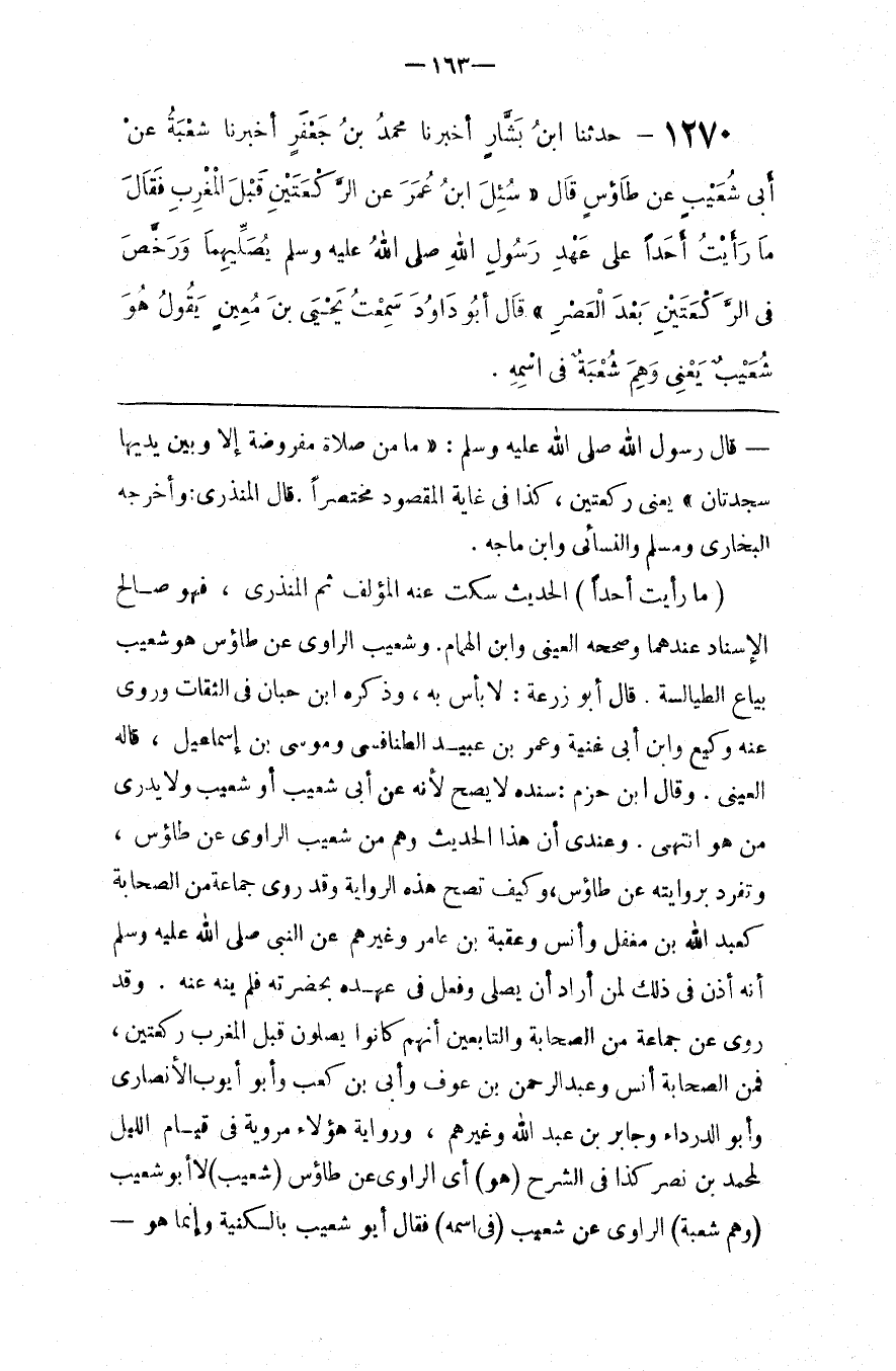 : الْحَدِيث سَكَتَ عَنْهُ الْمُؤَلِّف ثُمَّ الْمُنْذِرِيُّ ، فَهُوَ صَالِح الْإِسْنَاد عِنْدهمَا وَصَحَّحَهُ الْعَيْنِيّ وَابْن الْهُمَام . وَشُعَيْب الرَّاوِي عَنْ طَاوُس هُوَ شُعَيْب بَيَّاع الطَّيَالِسَة . قَالَ أَبُو زُرْعَة : لَا بَأْس بِهِ ، وَذَكَرَهُ اِبْن حِبَّان فِي الثِّقَات وَرَوَى عَنْهُ وَكِيع وَابْن أَبِي غُنْيَة وَعُمَر بْن عُبَيْد الطَّنَافِسِيّ وَمُوسَى بْن إِسْمَاعِيل ، قَالَهُ الْعَيْنِيّ . وَقَالَ اِبْن حَزْم : سَنَده لَا يَصِحّ لِأَنَّهُ عَنْ أَبِي شُعَيْب أَوْ شُعَيْب وَلَا يُدْرَى مَنْ هُوَ اِنْتَهَى . وَعِنْدِي أَنَّ هَذَا الْحَدِيث وَهْم مِنْ شُعَيْب الرَّاوِي عَنْ طَاوُس ، وَتَفَرَّدَ بِرِوَايَتِهِ عَنْ طَاوُس ، وَكَيْف تَصِحّ هَذِهِ الرِّوَايَة وَقَدْ رَوَى جَمَاعَة مِنْ الصَّحَابَة كَعَبْدِ اللَّه بْن مُغَفَّل وَأَنَس وَعُقْبَة بْن عَامِر وَغَيْرهمْ عَنْ النَّبِيّ صَلَّى اللَّه عَلَيْهِ وَسَلَّمَ أَنَّهُ أَذِنَ فِي ذَلِكَ لِمَنْ أَرَادَ أَنْ يُصَلِّي وَفُعِلَ فِي عَهْده بِحَضْرَتِهِ فَلَمْ يَنْهَ عَنْهُ . وَقَدْ رُوِيَ عَنْ جَمَاعَة مِنْ الصَّحَابَة وَالتَّابِعِينَ أَنَّهُمْ كَانُوا يُصَلُّونَ قَبْل الْمَغْرِب رَكْعَتَيْنِ ، فَمِنْ الصَّحَابَة أَنَس وَعَبْد الرَّحْمَن بْن عَوْف وَأُبَيّ بْن كَعْب وَأَبُو أَيُّوب الْأَنْصَارِيّ وَأَبُو الدَّرْدَاء وَجَابِر بْن عَبْد اللَّه وَغَيْرهمْ ، وَرِوَايَة هَؤُلَاءِ مَرْوِيَّة فِي قِيَام اللَّيْل لِمُحَمَّدِ بْن نَصْر كَذَا فِي الشَّرْح