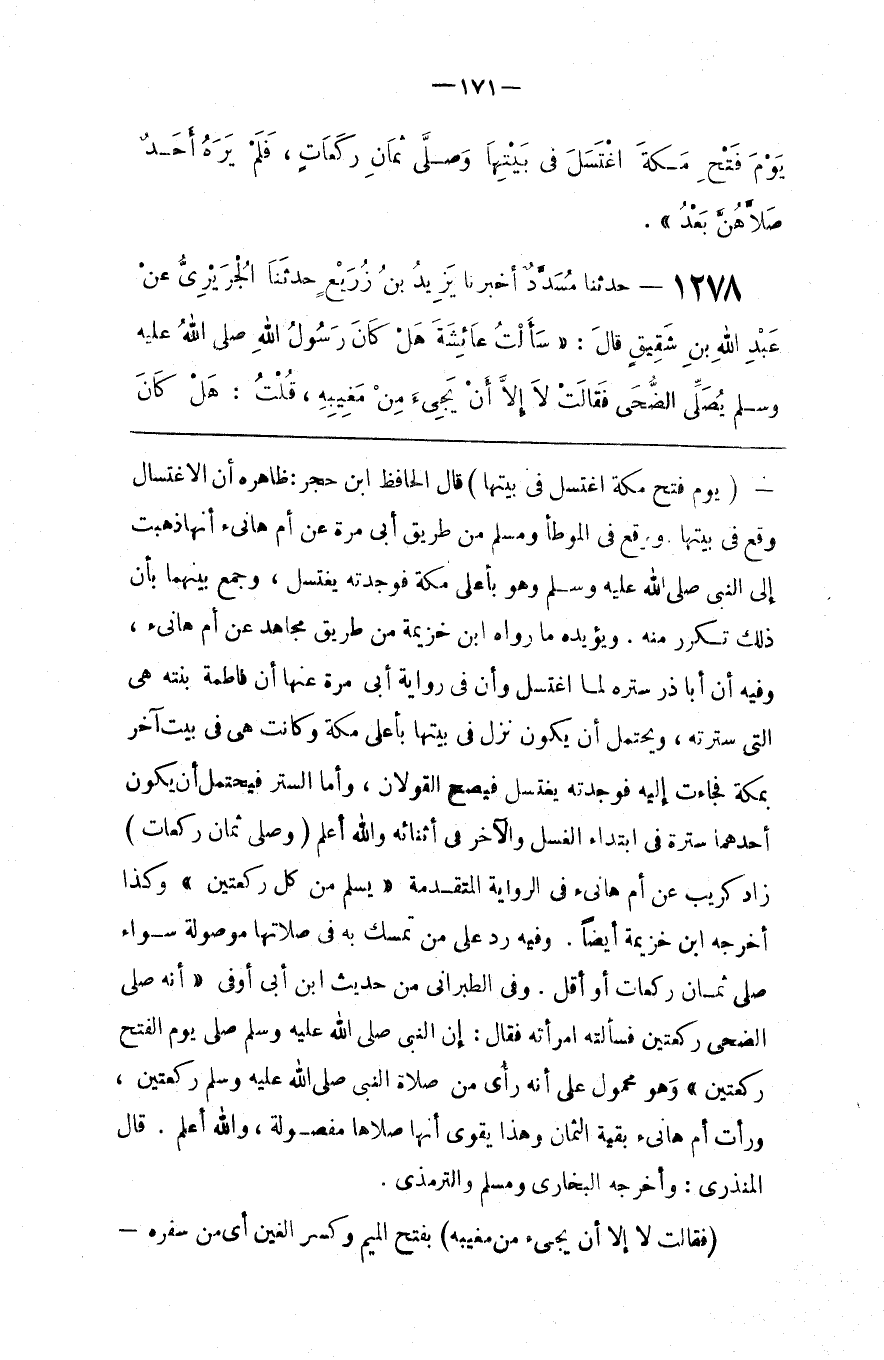 : زَادَ كُرَيْب عَنْ أُمّ هَانِئ فِي الرِّوَايَة الْمُتَقَدِّمَة " يُسَلَّم مِنْ كُلّ رَكْعَتَيْنِ " وَكَذَا أَخْرَجَهُ اِبْن خُزَيْمَةَ أَيْضًا . وَفِيهِ رَدّ عَلَى مَنْ تَمَسّك بِهِ فِي صَلَاتهَا مَوْصُولَة سَوَاء صَلَّى ثَمَان رَكَعَات أَوْ أَقَلّ . وَفِي الطَّبَرَانِيّ مِنْ حَدِيث اِبْن أَبِي أَوْفَى " أَنَّهُ صَلَّى الضُّحَى رَكْعَتَيْنِ فَسَأَلَتْهُ اِمْرَأَته فَقَالَ : إِنَّ النَّبِيّ صَلَّى اللَّه عَلَيْهِ وَسَلَّمَ صَلَّى يَوْم الْفَتْح رَكْعَتَيْنِ " وَهُوَ مَحْمُول عَلَى أَنَّهُ رَأَى مِنْ صَلَاة النَّبِيّ صَلَّى اللَّه عَلَيْهِ وَسَلَّمَ رَكْعَتَيْنِ ، وَرَأَتْ أُمّ هَانِئ بَقِيَّة الثَّمَان وَهَذَا يُقَوِّي أَنَّهُ صَلَّاهَا مَفْصُولَة ، وَاَللَّه أَعْلَم