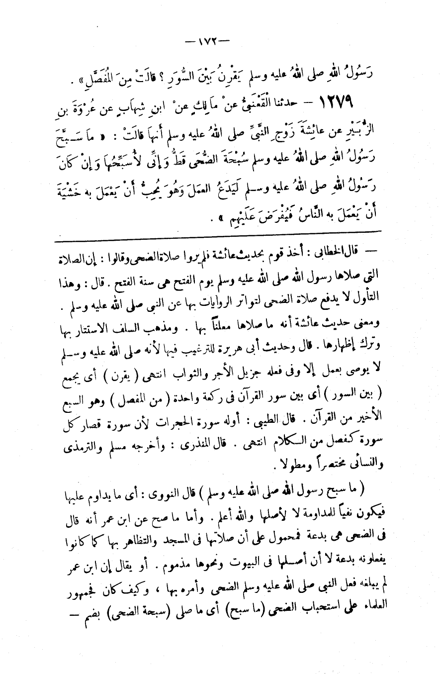 قَالَ الْخَطَّابِيُّ : أَخَذَ قَوْم بِحَدِيثِ عَائِشَة فَلَمْ يَرَوْا صَلَاة الضُّحَى وَقَالُوا : إِنَّ الصَّلَاة الَّتِي صَلَّاهَا رَسُول اللَّه صَلَّى اللَّه عَلَيْهِ وَسَلَّمَ يَوْم الْفَتْح هِيَ سُنَّة الْفَتْح . قَالَ : وَهَذَا التَّأَوُّل لَا يَدْفَع صَلَاة الضُّحَى لِتَوَاتُرِ الرِّوَايَات بِهَا عَنْ النَّبِيّ صَلَّى اللَّه عَلَيْهِ وَسَلَّمَ . وَمَعْنَى حَدِيث عَائِشَة أَنَّهُ مَا صَلَّاهَا مُعْلِنًا بِهَا . وَمَذْهَب السَّلَف الِاسْتِتَار بِهَا وَتَرْك إِظْهَارهَا . قَالَ وَحَدِيث أَبِي هُرَيْرَة لِلتَّرْغِيبِ فِيهَا لِأَنَّهُ صَلَّى اللَّه عَلَيْهِ وَسَلَّمَ لَا يُوصِي بِعَمَلٍ إِلَّا وَفِي فِعْله جَزِيل الْأَجْر وَالثَّوَاب اِنْتَهَى