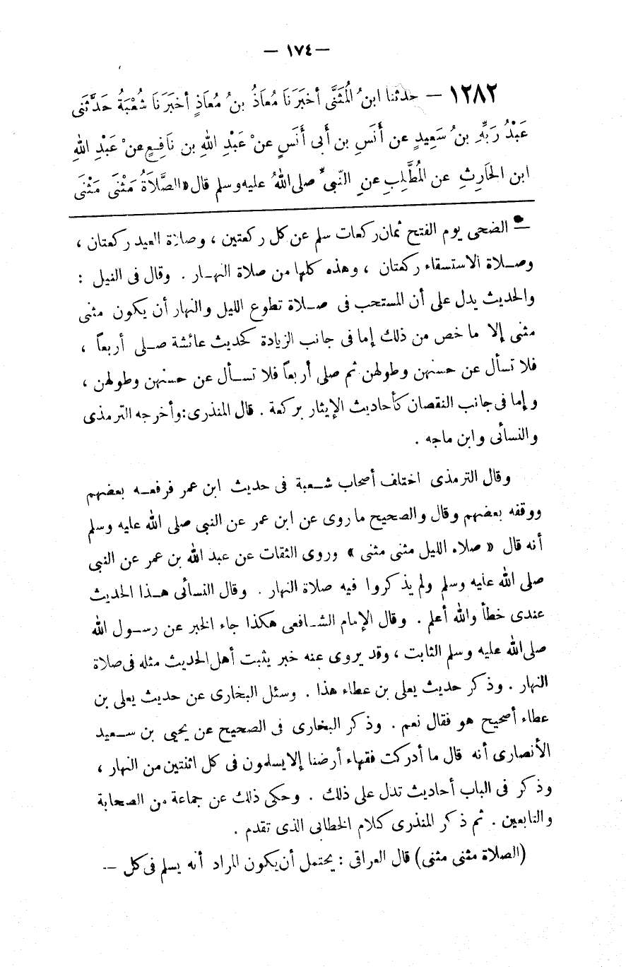 الضُّحَى يَوْم الْفَتْح ثَمَان رَكَعَات سَلَّمَ عَنْ كُلّ رَكْعَتَيْنِ ، وَصَلَاة الْعِيد رَكْعَتَانِ ، وَصَلَاة الِاسْتِسْقَاء رَكْعَتَانِ ، وَهَذِهِ كُلّهَا مِنْ صَلَاة النَّهَار . وَقَالَ فِي النَّيْل . وَالْحَدِيث يَدُلّ عَلَى أَنَّ الْمُسْتَحَبّ فِي صَلَاة تَطَوُّعِ اللَّيْل وَالنَّهَار أَنْ يَكُون مَثْنَى مَثْنَى إِلَّا مَا خُصَّ مِنْ ذَلِكَ إِمَّا مِنْ جَانِب الزِّيَادَة كَحَدِيثِ عَائِشَة صَلَّى أَرْبَعًا ، فَلَا تَسْأَل عَنْ حُسْنهنَّ وَطُولهنَّ ثُمَّ صَلَّى أَرْبَعًا فَلَا تَسْأَل عَنْ حُسْنهنَّ وَطُولهنَّ ، وَإِمَّا فِي جَانِب النُّقْصَان كَأَحَادِيث الْإِيثَار بِرَكْعَةٍ