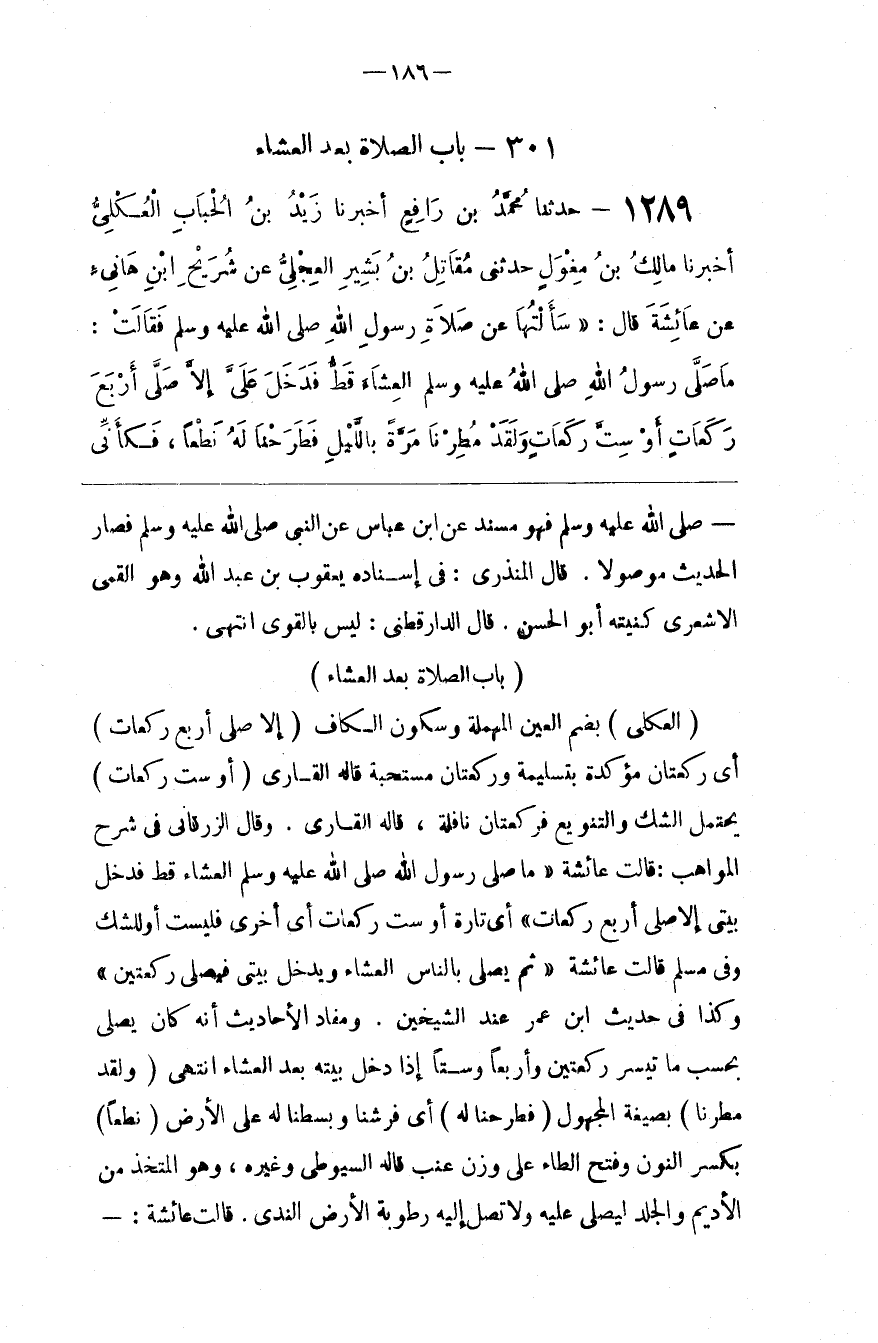 : يَحْتَمِل الشَّكّ وَالتَّنْوِيع فَرَكْعَتَانِ نَافِلَة ، قَالَهُ الْقَارِي . وَقَالَ الزُّرْقَانِيّ فِي شَرْح الْمَوَاهِب : قَالَتْ عَائِشَة " مَا صَلَّى رَسُول اللَّه صَلَّى اللَّه عَلَيْهِ وَسَلَّمَ الْعِشَاء قَطّ فَدَخَلَ بَيْتِي إِلَّا صَلَّى أَرْبَع رَكَعَات " أَيْ تَارَة أَوْ سِتّ رَكَعَات أَيْ أُخْرَى فَلَيْسَتْ أَوْ لِلشَّكِّ وَفِي مُسْلِم قَالَتْ عَائِشَة " ثُمَّ يُصَلِّي بِالنَّاسِ الْعِشَاء وَيَدْخُل بَيْتِي فَيُصَلِّي رَكْعَتَيْنِ " وَكَذَا فِي حَدِيث اِبْن عُمَر الشَّيْخَيْنِ . وَمُفَاد الْأَحَادِيث أَنَّهُ كَانَ يُصَلِّي بِحَسَبِ مَا تَيَسَّرَ رَكْعَتَيْنِ وَأَرْبَعًا وَسِتًّا إِذَا دَخَلَ بَيْته بَعْد الْعِشَاء اِنْتَهَى