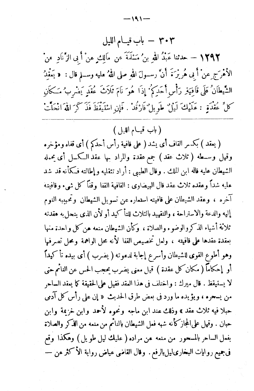 : قِيلَ مَعْنَى يَضْرِب يَحْجُب الْحِسّ عَنْ النَّائِم حَتَّى لَا يَسْتَيْقِظ . قَالَ مَيْرك : وَاخْتُلِفَ فِي هَذَا الْعَقْد فَقِيلَ عَلَى الْحَقِيقَة كَمَا يَعْقِد السَّاحِر مَنْ يَسْحَرهُ ، وَيُؤَيِّدهُ مَا وَرَدَ فِي بَعْض طُرُق الْحَدِيث " إِنَّ عَلَى رَأْس كُلّ آدَمِيّ حَبْلًا فِيهِ ثَلَاث عُقَد " وَذَلِكَ عِنْد اِبْن مَاجَهْ وَنَحْوه لِأَحْمَد وَابْن خُزَيْمَةَ وَابْن حِبَّان . وَقِيل عَلَى الْمَجَاز كَأَنَّهُ شَبَّهَ فِعْل الشَّيْطَان بِالنَّائِمِ مِنْ مَنْعه مِنْ الذِّكْر وَالصَّلَاة بِفِعْلِ السَّاحِر بِالْمَسْحُورِ مِنْ مَنْعه عَنْ مُرَاده