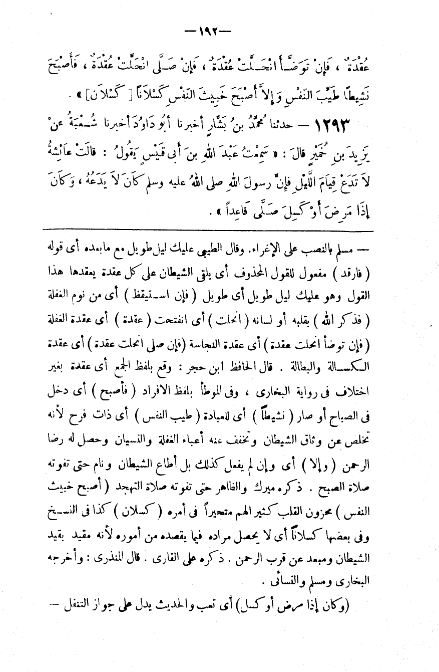 : كَذَا فِي النُّسَخ وَفِي بَعْضهَا كَسْلَانًا أَيْ لَا يَحْصُل مُرَاده فِيمَا يَقْصِدهُ مِنْ أُمُوره لِأَنَّهُ مُقَيَّد بِقَيْدِ الشَّيْطَان وَمُبْعَد عَنْ قُرْب الرَّحْمَن . ذَكَرَهُ عَلِيّ الْقَارِي . قَالَ الْمُنْذِرِيُّ : وَأَخْرَجَهُ الْبُخَارِيّ وَمُسْلِم وَالنَّسَائِيّ .