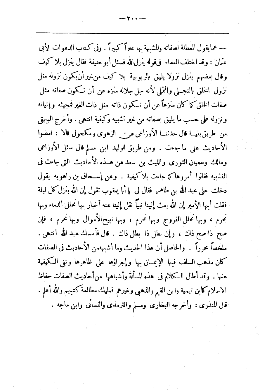 عَمَّا يَقُول الْمُعَطِّلَة لِصِفَاتِهِ وَالْمُشَبِّهَة بِهَا عُلُوًّا كَبِيرًا . وَفِي كِتَاب الدَّعَوَات لِأَبِي عُثْمَان : وَقَدْ اِخْتَلَفَ الْعُلَمَاء فِي قَوْله يَنْزِل اللَّه فَسُئِلَ أَبُو حَنِيفَة فَقَالَ يَنْزِل بِلَا كَيْف وَقَالَ بَعْضهمْ يَنْزِل نُزُولًا يَلِيق بِالرُّبُوبِيَّةِ بِلَا كَيْف مِنْ غَيْر أَنْ يَكُون نُزُوله مِثْل نُزُول الْخَلْق بِالتَّجَلِّي وَالتَّمَلِّي لِأَنَّهُ جَلَّ جَلَاله مُنَزَّه عَنْ أَنْ تَكُون صِفَاته مِثْل صِفَات الْخَلْق كَمَا كَانَ مُنَزَّهًا عَنْ أَنْ تَكُون ذَاته مِثْل ذَات الْغَيْر فَمَجِيئُهُ وَإِتْيَانه وَنُزُوله عَلَى حَسْب مَا يَلِيق بِصِفَاتِهِ مِنْ غَيْر تَشْبِيه وَكَيْفِيَّة اِنْتَهَى . وَأَخْرَجَ الْبَيْهَقِيّ مِنْ طَرِيق بَقِيَّة قَالَ حَدَّثَنَا الْأَوْزَاعِيّ عَنْ الزَّهَوِيّ وَمَكْحُول قَالَا : أَمْضُوا الْأَحَادِيث عَلَى مَا جَاءَتْ . وَمِنْ طَرِيق الْوَلِيد بْن مُسْلِم قَالَ سُئِلَ الْأَوْزَاعِيُّ وَمَالِك وَسُفْيَان الثَّوْرِيّ وَاللَّيْث بْن سَعْد عَنْ هَذِهِ الْأَحَادِيث الَّتِي جَاءَتْ فِي التَّشْبِيه فَقَالُوا أَمِرُّوهَا كَمَا جَاءَتْ بِلَا كَيْفِيَّة . وَعَنْ إِسْحَاق بْن رَاهْوَيْهِ يَقُول دَخَلْت عَلَى عَبْد اللَّه بْن طَاهِر فَقَالَ لِي يَا أَبَا يَعْقُوب تَقُول إِنَّ اللَّه يَنْزِل كُلّ لَيْلَة فَقُلْت أَيّهَا الْأَمِير إِنَّ اللَّه بَعَثَ إِلَيْنَا نَبِيًّا نَقَلَ إِلَيْنَا عَنْهُ أَخْبَارًا بِهَا نُحَلِّل الدِّمَاء وَبِهَا نُحَرِّم . وَبِهَا نُحَلِّل الْفُرُوج وَبِهَا نُحَرِّم ، وَبِهَا نُبِيح الْأَمْوَال وَبِهَا نُحَرِّم ، فَإِنْ صَحَّ ذَا صَحَّ ذَاكَ ، وَإِنْ بَطَل ذَا بَطَل ذَاكَ . قَالَ فَأَمْسَكَ عَبْد اللَّه اِنْتَهَى . مُلَخَّصًا مُحَرَّرًا وَالْحَاصِل أَنَّ هَذَا الْحَدِيث وَمَا أَشْبَهَهُ مِنْ الْأَحَادِيث فِي الصِّفَات كَانَ مَذْهَب السَّلَف فِيهَا الْإِيمَان بِهَا وَإِجْرَاؤُهَا عَلَى ظَاهِرهَا وَنَفْي الْكَيْفِيَّة عَنْهَا . وَقَدْ أَطَالَ الْكَلَام فِي هَذِهِ الْمَسْأَلَة وَأَشْبَاههَا مِنْ أَحَادِيث الصِّفَات حُفَّاظ الْإِسْلَام كَابْنِ تَيْمِيَة وَابْن الْقَيِّم وَالذَّهَبِيّ وَغَيْرهمْ فَعَلَيْك مُطَالَعَة كُتُبهمْ وَاَللَّه أَعْلَم .