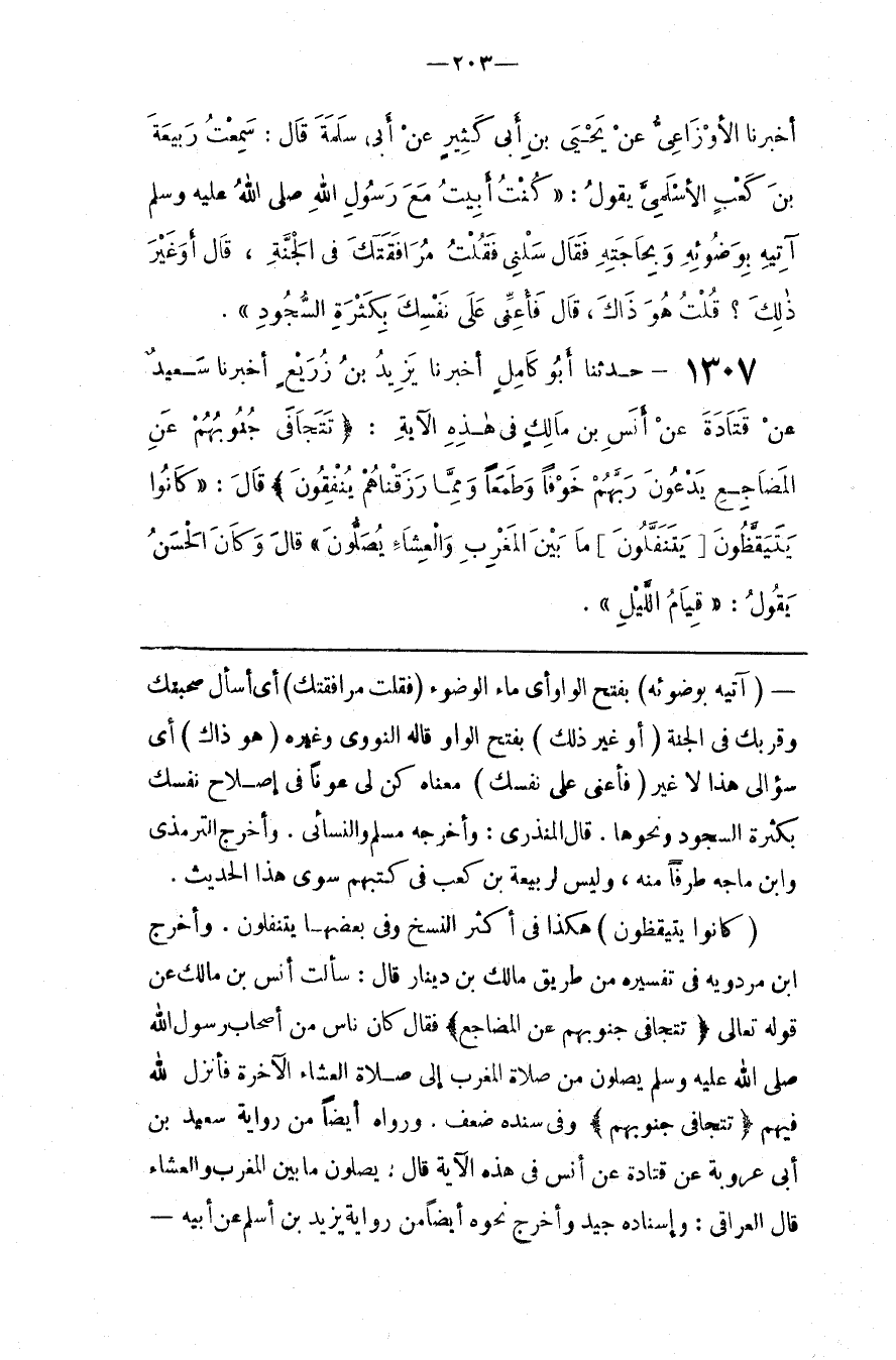 : هَكَذَا فِي أَكْثَر النُّسَخ وَفِي بَعْضهَا يَتَنَفَّلُونَ . وَأَخْرَجَ اِبْن مَرْدَوَيْهِ فِي تَفْسِيره مِنْ طَرِيق مَالِك بْن دِينَار قَالَ : سَأَلْت أَنَس بْن مَالِك عَنْ قَوْله تَعَالَى { تَتَجَافَى جَنُوبهمْ عَنْ الْمَضَاجِع } فَقَالَ كَانَ نَاس مِنْ أَصْحَاب رَسُول اللَّه صَلَّى اللَّه عَلَيْهِ وَسَلَّمَ يُصَلُّونَ مِنْ صَلَاة الْمَغْرِب إِلَى صَلَاة الْعِشَاء الْآخِرَة فَأَنْزَلَ اللَّه فِيهِمْ { تَتَجَافَى جَنُوبهمْ } وَفِي سَنَده ضَعْف . وَرَوَاهُ أَيْضًا مِنْ رِوَايَة سَعِيد بْن أَبِي عَرُوبَة عَنْ قَتَادَة عَنْ أَنَس فِي هَذِهِ الْآيَة قَالَ : يُصَلُّونَ مَا بَيْن الْمَغْرِب وَالْعِشَاء قَالَ الْعِرَاقِيّ : وَإِسْنَاده جَيِّد وَأَخْرَجَ نَحْوه أَيْضًا مِنْ رِوَايَة يَزِيد بْن أَسْلَمَ عَنْ أَبِيهِ@