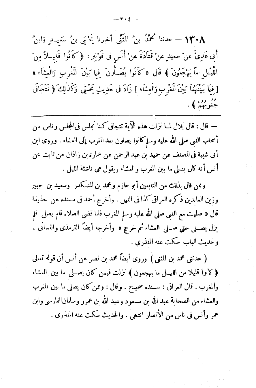 : وَرَوَى أَيْضًا مُحَمَّد بْن نَصْر عَنْ أَنَس أَنَّ قَوْله تَعَالَى { كَانُوا قَلِيلًا مِنْ اللَّيْل مَا يَهْجَعُونَ } نَزَلَتْ فِيمَنْ كَانَ يُصَلِّي مَا بَيْن الْعِشَاء وَالْمَغْرِب . قَالَ الْعِرَاقِيّ : سَنَده صَحِيح . وَقَالَ : وَمِمَّنْ كَانَ يُصَلِّي مَا بَيْن الْمَغْرِب وَالْعِشَاء مِنْ الصَّحَابَة عَبْد اللَّه بْن مَسْعُود وَعَبْد اللَّه بْن عَمْرو وَسَلْمَان الْفَارِسِيّ وَابْن عُمَر وَأَنَس فِي نَاس مِنْ الْأَنْصَار اِنْتَهَى . وَالْحَدِيث سَكَتَ عَنْهُ الْمُنْذِرِيُّ@