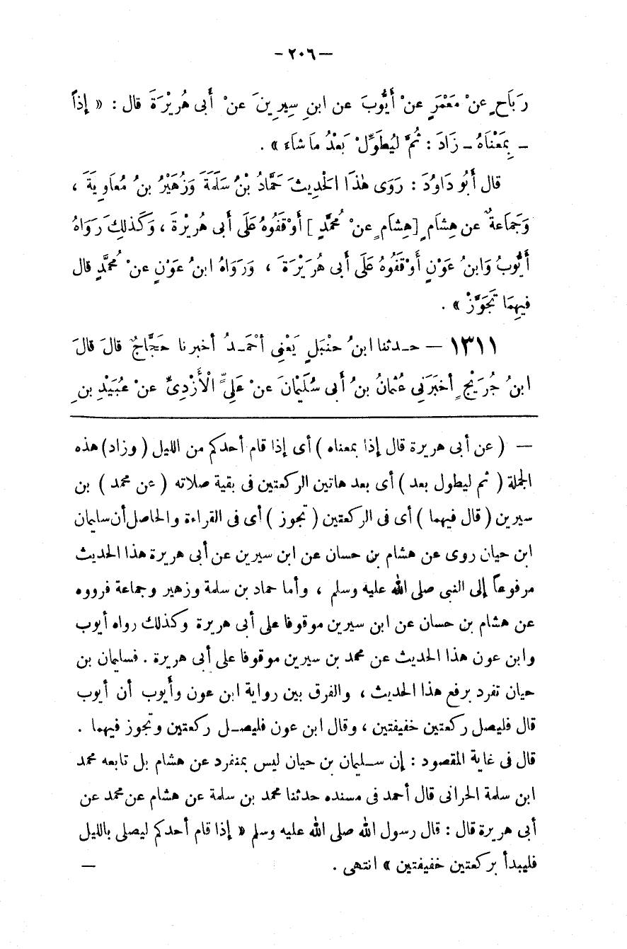 : أَيْ فِي الْقِرَاءَة وَالْحَاصِل أَنَّ سُلَيْمَان بْن حَيَّان رَوَى عَنْ هِشَام بْن حَسَّان عَنْ اِبْن سِيرِينَ عَنْ أَبِي هُرَيْرَة هَذَا الْحَدِيث مَرْفُوعًا إِلَى النَّبِيّ صَلَّى اللَّه عَلَيْهِ وَسَلَّمَ ، وَأَمَّا حَمَّاد بْن سَلَمَة وَزُهَيْر وَجَمَاعَة فَرَوَوْهُ عَنْ هِشَام بْن حَسَّان عَنْ اِبْن سِيرِينَ مَوْقُوفًا عَلَى أَبِي هُرَيْرَة وَكَذَلِكَ رَوَى أَيُّوب وَابْن عَوْن هَذَا الْحَدِيث عَنْ مُحَمَّد بْن سِيرِينَ مَوْقُوفًا عَلَى أَبِي هُرَيْرَة . فَسُلَيْمَان بْن حَيَّان تَفَرَّدَ بِرَفْعِ هَذَا الْحَدِيث ، وَالْفَرْق بَيْن رِوَايَة اِبْن عَوْن وَأَيُّوب أَنَّ أَيُّوب قَالَ فَلْيُصَلِّ رَكْعَتَيْنِ خَفِيفَتَيْنِ ، وَقَالَ اِبْن عَوْن فَلْيُصَلِّ رَكْعَتَيْنِ وَتَجَوَّزَ فِيهِمَا . قَالَ فِي غَايَة الْمَقْصُود : إِنَّ سُلَيْمَان بْن حَيَّان لَيْسَ بِمُنْفَرِدٍ عَنْ هِشَام بَلْ تَابَعَهُ مُحَمَّد بْن سَلَمَة الْحَرَّانِيّ قَالَ أَحْمَد فِي مُسْنَده حَدَّثَنَا مُحَمَّد بْن سَلَمَة عَنْ هِشَام عَنْ مُحَمَّد بْن أَبِي هُرَيْرَة قَالَ : قَالَ رَسُول اللَّه صَلَّى اللَّه عَلَيْهِ وَسَلَّمَ : " إِذَا قَامَ أَحَدكُمْ لِيُصَلِّيَ بِاللَّيْلِ فَلْيَبْدَأْ بِرَكْعَتَيْنِ خَفِيفَتَيْنِ " اِنْتَهَى .@