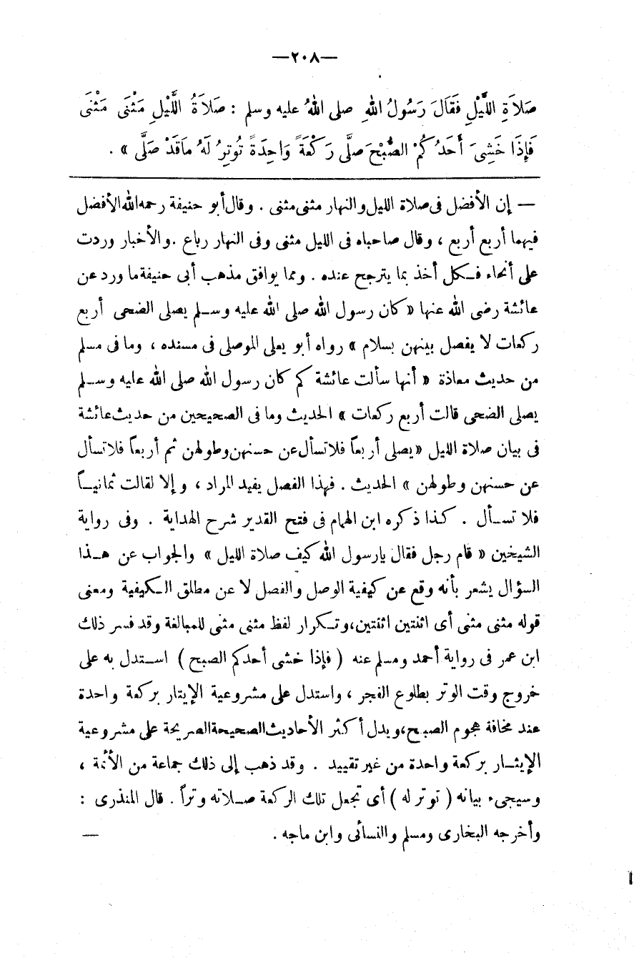 إِنَّ الْأَفْضَل فِي صَلَاة اللَّيْل وَالنَّهَار مَثْنَى مَثْنَى . وَقَالَ أَبُو حَنِيفَة رَحِمَهُ اللَّه الْأَفْضَل فِيهِمَا أَرْبَع أَرْبَع ، وَمَالَ صَاحِبَاهُ فِي اللَّيْل مَثْنَى وَفِي النَّهَار رُبَاع . وَالْأَخْبَار وَرَدَتْ عَلَى أَنْحَاء فَكُلّ أَخَذَ بِمَا يَتَرَجَّح عِنْده . وَمِمَّا يُوَافِق مَذْهَب أَبِي حَنِيفَة مَا وَرَدَ عَنْ عَائِشَة رَضِيَ اللَّه عَنْهَا " كَانَ رَسُول اللَّه صَلَّى اللَّه عَلَيْهِ وَسَلَّمَ يُصَلِّي الضُّحَى أَرْبَع رَكَعَات لَا يَفْصِل بَيْنهنَّ بِسَلَامٍ ، رَوَاهُ أَبُو يَعْلَى الْمَوْصِلِيّ فِي مُسْنَده ، وَمَا فِي مُسْلِم مِنْ حَدِيث مُعَاذَة : " أَنَّهَا سَأَلَتْ عَائِشَة كَمْ كَانَ رَسُول اللَّه صَلَّى اللَّه عَلَيْهِ وَسَلَّمَ يُصَلِّي الضُّحَى قَالَتْ أَرْبَع رَكَعَات " الْحَدِيث وَمَا فِي الصَّحِيحَيْنِ مِنْ حَدِيث عَائِشَة فِي بَيَان صَلَاة اللَّيْل : " يُصَلِّي أَرْبَعًا فَلَا تَسْأَل عَنْ حُسْنهنَّ وَطُولهنَّ ثُمَّ أَرْبَعًا فَلَا تَسْأَل عَنْ حُسْنهنَّ وَطُولهنَّ " الْحَدِيث . فَهَذَا الْفَصْل يُفِيد الْمُرَاد ، وَإِلَّا لَقَالَتْ ثَمَانِيًا فَلَا تَسْأَل . كَذَا ذَكَرَهُ اِبْن الْهُمَام فِي فَتْح الْقَدِير شَرْح الْهِدَايَة . وَفِي رِوَايَة الشَّيْخَيْنِ " قَامَ رَجُل فَقَالَ يَا رَسُول اللَّه كَيْفَ صَلَاة اللَّيْل " وَالْجَوَاب عَنْ هَذَا السُّؤَال يُشْعِر بِأَنَّهُ وَقَعَ عَنْ كَيْفِيَّة الْوَصْل وَالْفَصْل لَا عَنْ مُطْلَق الْكَيْفِيَّة وَمَعْنَى قَوْله مَثْنَى مَثْنَى أَيْ اِثْنَتَيْنِ اِثْنَتَيْنِ ، وَتَكْرَار لَفْظ مَثْنَى مَثْنَى لِلْمُبَالَغَةِ وَقَدْ فَسَّرَ ذَلِكَ اِبْن عُمَر فِي رِوَايَة أَحْمَد وَمُسْلِم عَنْهُ .