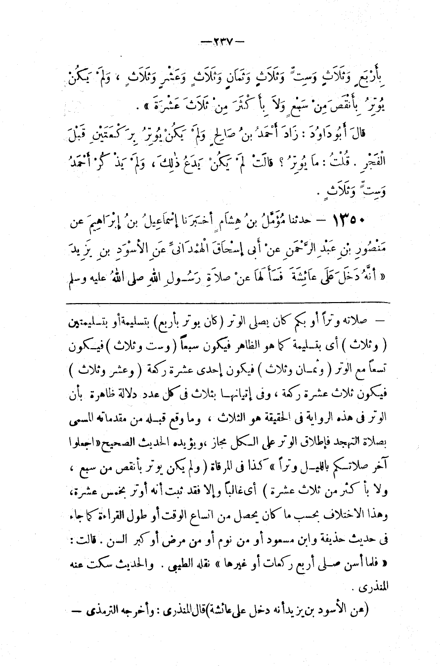 ( وَلَمْ يَكُنْ يُوتِر بِأَنْقَص مِنْ سَبْع ، وَلَا بِأَكْثَر مِنْ ثَلَاث عَشْرَة )