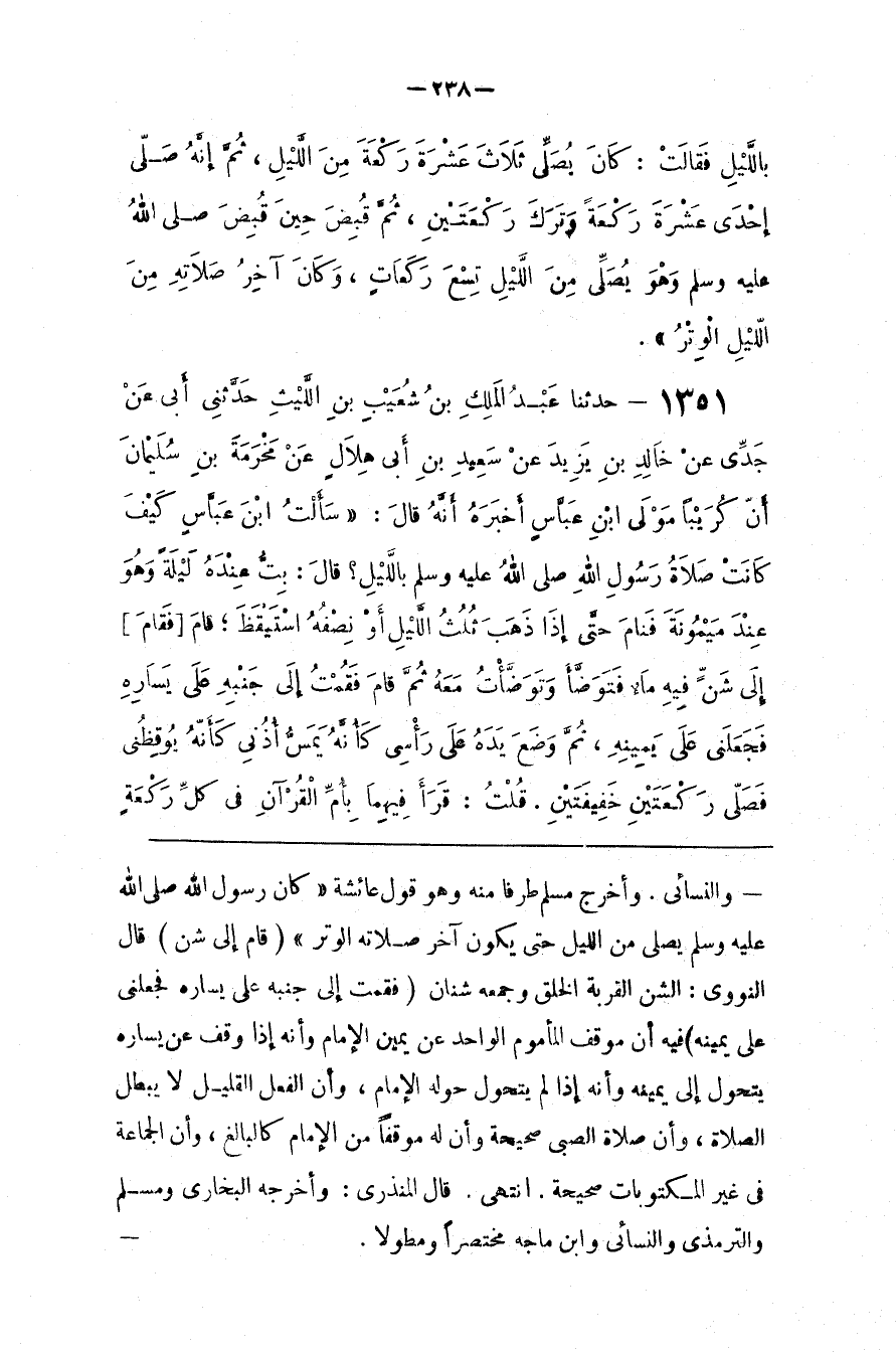 وَالنَّسَائِيّ . وَأَخْرَجَ مُسْلِم طَرَفًا مِنْهُ وَهُوَ قَوْل عَائِشَة " كَانَ رَسُول اللَّه صَلَّى اللَّه عَلَيْهِ وَسَلَّمَ يُصَلِّي مِنْ اللَّيْل حَتَّى يَكُون آخِر صَلَاته الْوِتْر " .