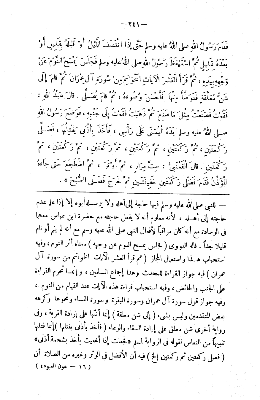 : فِيهِ جَوَاز الْقِرَاءَة لِلْمُحَدِّثِ وَهَذَا إِجْمَاع الْمُسْلِمِينَ ، وَإِنَّمَا تَحْرُم الْقِرَاءَة عَلَى الْجُنُب وَالْحَائِض ، وَفِيهِ اِسْتِحْبَاب قِرَاءَة هَذِهِ الْآيَات عِنْد الْقِيَام مِنْ النَّوْم ، وَفِيهِ جَوَاز قَوْل سُورَة آلِ عِمْرَان وَسُورَة الْبَقَرَة وَسُورَة النِّسَاء وَنَحْوهَا وَكَرِهَهُ بَعْض الْمُتَقَدِّمِينَ وَلَيْسَ بِشَيْءٍ