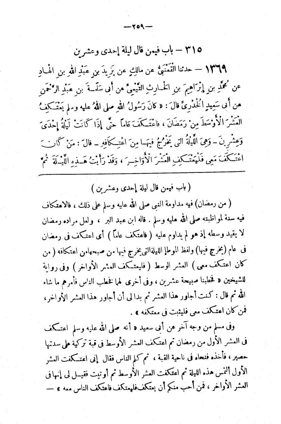 وَفِي مُسْلِم مِنْ وَجْه آخَر عَنْ أَبِي سَعِيد " أَنَّهُ صَلَّى اللَّه عَلَيْهِ وَسَلَّمَ اِعْتَكَفَ فِي الْعَشْر الْأُوَل مِنْ رَمَضَان ثُمَّ اِعْتَكَفَ الْعَشْر الْأَوْسَطَ فِي قُبَّة تُرْكِيَّة عَلَى سُدَّتهَا حَصِير ، فَأَخَذَهُ فَنَحَاهُ فِي نَاحِيَة الْقُبَّة ، ثُمَّ كَلَّمَ النَّاس فَقَالَ إِنِّي اِعْتَكَفْت الْعَشْر الْأُوَلَ أَلْتَمِسُ هَذِهِ اللَّيْلَة ثُمَّ اِعْتَكَفْت الْعَشْر الْأَوْسَط ثُمَّ أُوتِيت فَقِيلَ لِي إِنَّهَا فِي الْعَشْر الْأَوَاخِر ، فَمَنْ أَحَبَّ مِنْكُمْ أَنْ يَعْتَكِفَ فَلْيَعْتَكِفْ فَاعْتَكَفَ النَّاس مَعَهُ "@