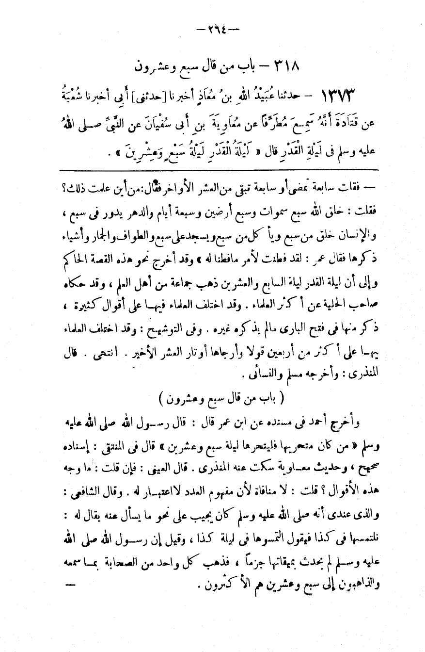 وَأَخْرَجَ أَحْمَد فِي مُسْنَدِهِ عَنْ اِبْن عُمَر قَالَ : قَالَ رَسُول اللَّه صَلَّى اللَّه عَلَيْهِ وَسَلَّمَ : " مَنْ كَانَ مُتَحَرِّيهَا فَلْيَتَحَرَّهَا لَيْلَة سَبْع وَعِشْرِينَ " قَالَ فِي الْمُنْتَقَى : إِسْنَاده صَحِيح ، وَحَدِيث مُعَاوِيَة سَكَتَ عَنْهُ الْمُنْذِرِيُّ . قَالَ الْعَيْنِيُّ : فَإِنْ قُلْت : مَا وَجْهُ هَذِهِ الْأَقْوَال ؟ قُلْت : لَا مُنَافَاةَ لِأَنَّ مَفْهُوم الْعَدَدِ لَا اِعْتِبَارَ لَهُ . وَقَالَ الشَّافِعِيُّ : وَاَلَّذِي عِنْدِي أَنَّهُ صَلَّى اللَّه عَلَيْهِ وَسَلَّمَ كَانَ يُجِيبُ عَلَى نَحْو مَا يُسْأَلُ عَنْهُ يُقَالُ لَهُ : نَلْتَمِسُهَا فِي كَذَا فَيَقُولُ اِلْتَمِسُوهَا فِي لَيْلَة كَذَا ، وَقِيلَ إِنَّ رَسُول اللَّه صَلَّى اللَّه عَلَيْهِ وَسَلَّمَ لَمْ يُحَدِّث بِمِيقَاتِهَا جَزْمًا ، فَذَهَبَ كُلُّ وَاحِد مِنْ الصَّحَابَةِ بِمَا سَمِعَهُ وَالذَّاهِبُونَ إِلَى سَبْع وَعِشْرِينَ هُمْ الْأَكْثَرُونَ .@