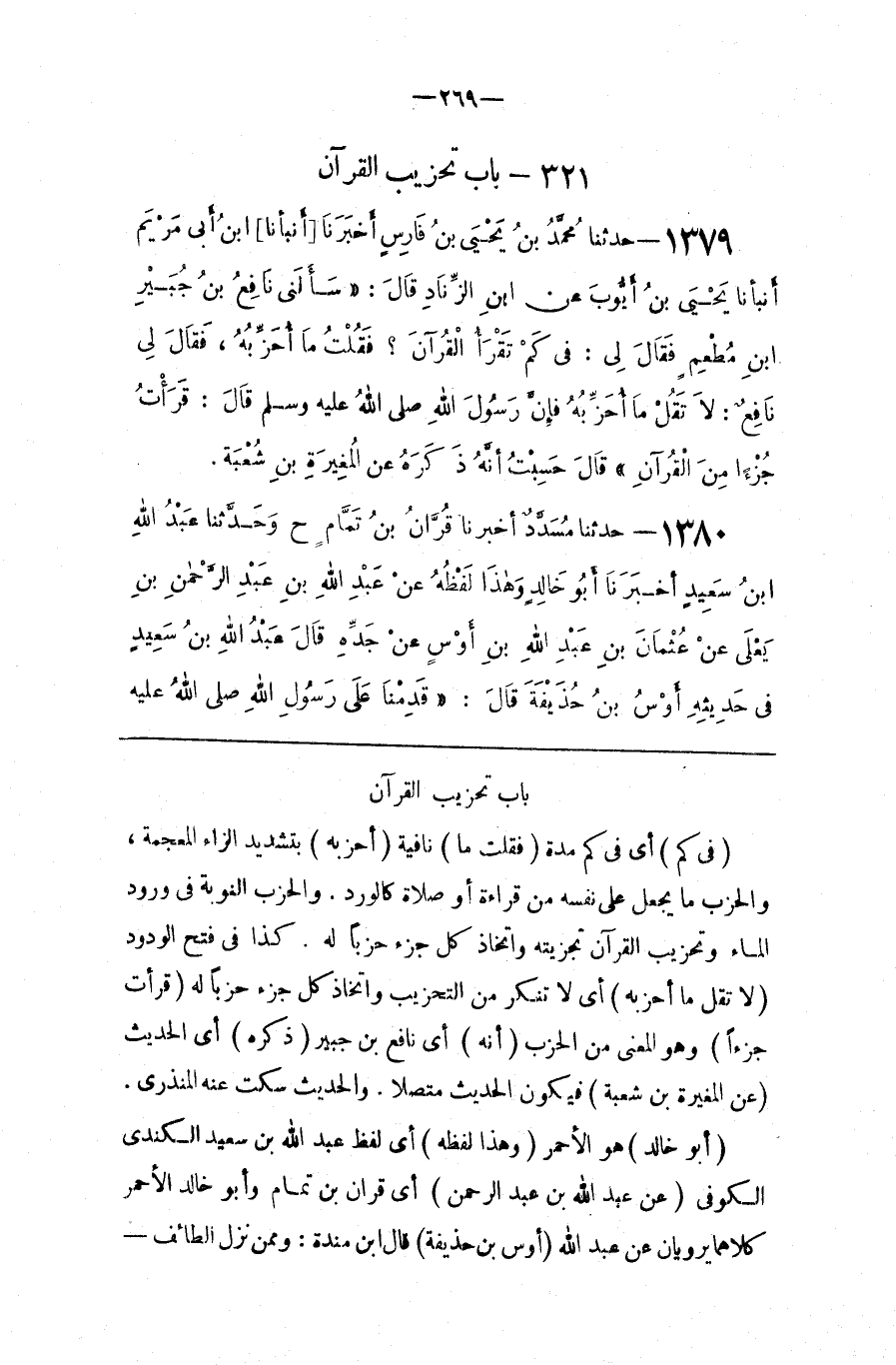 : بِتَشْدِيدِ الزَّاي الْمُعْجَمَة ، وَالْحِزْب مَا يُجْعَلُ عَلَى نَفْسه مِنْ قِرَاءَة أَوْ صَلَاة كَالْوِرْدِ . وَالْحِزْبُ النَّوْبَةُ فِي وُرُودِ الْمَاء وَتَحْزِيب الْقُرْآن تَجْزِئَتُهُ وَاِتِّخَاذ كُلّ جُزْءٍ حِزْبًا لَهُ . كَذَا فِي فَتْح الْوَدُود