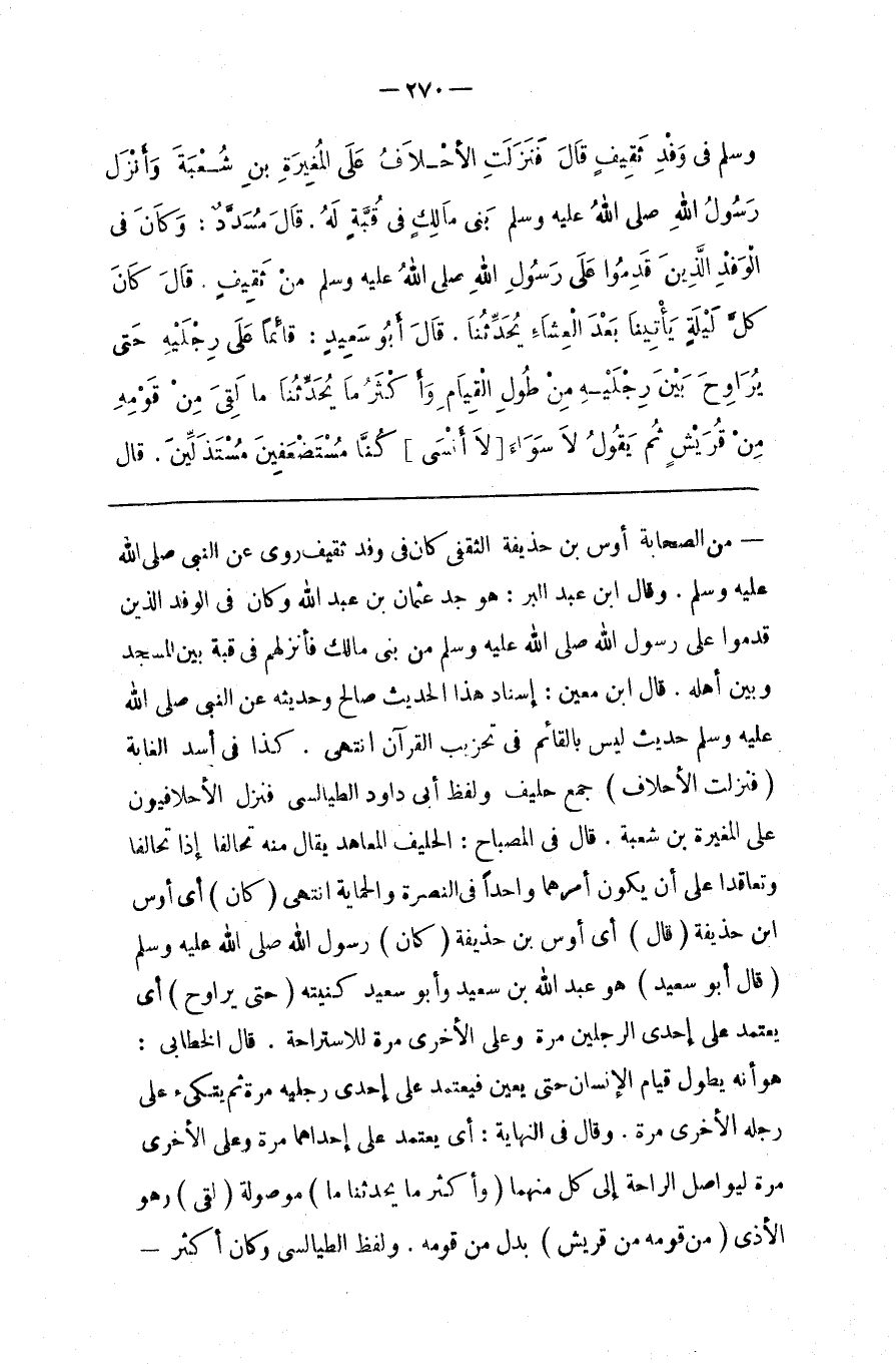 مِنْ الصَّحَابَة أَوْس بْن حُذَيْفَة الثَّقَفِيّ كَانَ فِي ثَقِيف رَوَى عَنْ النَّبِيّ صَلَّى اللَّه عَلَيْهِ وَسَلَّمَ . وَقَالَ اِبْن عَبْد الْبَرِّ : هُوَ جَدّ عُثْمَان بْن عَبْد اللَّه وَكَانَ فِي الْوَفْد الَّذِينَ قَدِمُوا عَلَى رَسُول اللَّه صَلَّى اللَّه عَلَيْهِ وَسَلَّمَ مِنْ بَنِي مَالِك فَأَنْزَلَهُمْ فِي قُبَّة بَيْن الْمَسْجِد وَبَيْن أَهْله . قَالَ اِبْن مَعِين : إِسْنَاد هَذَا الْحَدِيث صَالِح وَحَدِيثه عَنْ النَّبِيّ صَلَّى اللَّه عَلَيْهِ وَسَلَّمَ حَدِيثٌ لَيْسَ بِالْقَائِمِ فِي تَحْزِيب الْقُرْآن اِنْتَهَى .