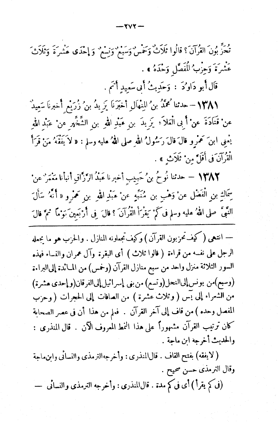 : مِنْ قَاف إِلَى آخِر الْقُرْآن . فَعُلِمَ مِنْ هَذَا أَنَّ فِي عَصْر الصَّحَابَة كَانَ تَرْتِيب الْقُرْآن مَشْهُورًا عَلَى هَذَا النَّمَط الْمَعْرُوف الْآنَ