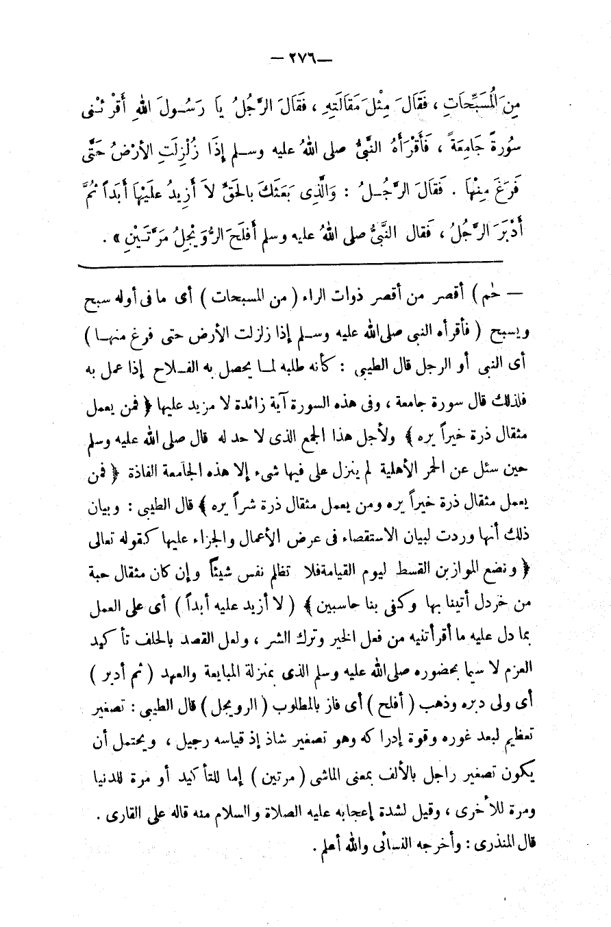 : أَيْ النَّبِيّ صَلَّى اللَّه عَلَيْهِ وَسَلَّمَ أَوْ الرَّجُل قَالَ الطِّيبِيُّ : كَأَنَّهُ طَلَبَهُ لِمَا يَحْصُلُ بِهِ الْفَلَاحُ إِذَا عَمِلَ بِهِ فَلِذَلِكَ قَالَ سُورَة جَامِعَة ، وَفِي هَذِهِ السُّورَة آيَة زَائِدَة لَا مَزِيد عَلَيْهَا { فَمَنْ يَعْمَلْ مِثْقَال ذَرَّةٍ خَيْرًا يَرَهُ } وَلِأَجْلِ هَذَا الْجَمْعِ الَّذِي لَا حَدَّ لَهُ قَالَ صَلَّى اللَّه عَلَيْهِ وَسَلَّمَ حِين سُئِلَ عَنْ الْحُمُرِ الْأَهْلِيَّةِ لَمْ يَنْزِلْ عَلَيَّ فِيهَا شَيْءٌ إِلَّا هَذِهِ الْجَامِعَة الْفَاذَّة { فَمَنْ يَعْمَلْ مِثْقَال ذَرَّة خَيْرًا يَرَهُ وَمَنْ يَعْمَلْ مِثْقَال ذَرَّة شَرًّا يَرَهُ } قَالَ الطِّيبِيُّ : وَبَيَانُ ذَلِكَ أَنَّهَا وَرَدَتْ لِبَيَانِ الِاسْتِقْصَاء فِي عَرْض الْأَعْمَال وَالْجَزَاء عَلَيْهَا كَقَوْلِهِ تَعَالَى : { وَنَضَعُ الْمَوَازِينَ الْقِسْطَ لِيَوْمِ الْقِيَامَة فَلَا تُظْلَمُ نَفْس شَيْئًا وَإِنْ كَانَ مِثْقَال حَبَّة مِنْ خَرْدَل أَتَيْنَا بِهَا وَكَفَى بِنَا حَاسِبِينَ }