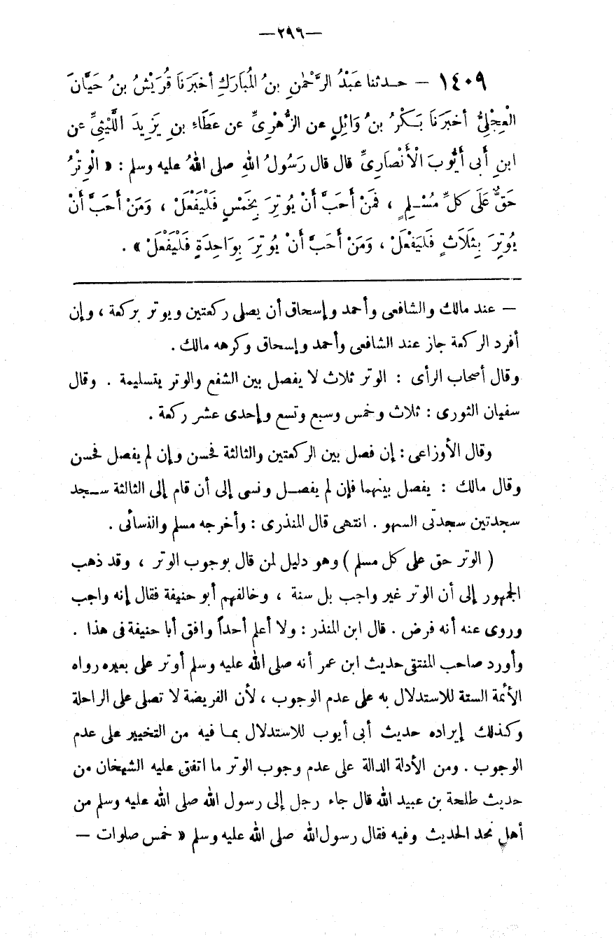: وَهُوَ دَلِيلٌ لِمَنْ قَالَ بِوُجُوبِ الْوِتْرِ ، وَقَدْ ذَهَبَ الْجُمْهُورُ إِلَى أَنَّ الْوِتْر غَيْر وَاجِب بَلْ سُنَّةٌ ، وَخَالَفَهُمْ أَبُو حَنِيفَة فَقَالَ إِنَّهُ وَاجِبٌ وَرُوِيَ عَنْهُ أَنَّهُ فَرْضٌ . قَالَ اِبْن الْمُنْذِرِ : وَلَا أَعْلَمُ أَحَدًا وَافَقَ أَبَا حَنِيفَة فِي هَذَا . وَأَوْرَدَ صَاحِب الْمُنْتَقَى حَدِيثَ اِبْن عُمَرَ أَنَّهُ صَلَّى اللَّه عَلَيْهِ وَسَلَّمَ أَوْتَرَ عَلَى بَعِيرِهِ رَوَاهُ الْأَئِمَّةُ السِّتَّةُ لِلِاسْتِدْلَالِ بِهِ عَلَى عَدَمِ الْوُجُوب ، لِأَنَّ الْفَرِيضَة لَا تُصَلَّى عَلَى الرَّاحِلَةِ وَكَذَلِكَ إِيرَادُهُ حَدِيثَ أَبِي أَيُّوب لِلِاسْتِدْلَالِ بِمَا فِيهِ مِنْ التَّخْيِير عَلَى عَدَمِ الْوُجُوبِ . وَمِنْ الْأَدِلَّةِ الدَّالَّةِ عَلَى عَدَم وُجُوبِ الْوِتْرِ مَا اِتَّفَقَ عَلَيْهِ الشَّيْخَانِ مِنْ حَدِيث طَلْحَةَ بْن عُبَيْد اللَّه قَالَ جَاءَ رَجُلٌ إِلَى رَسُولِ اللَّه صَلَّى اللَّه عَلَيْهِ وَسَلَّمَ مِنْ أَهْل نَجْدٍ الْحَدِيث وَفِيهِ فَقَالَ رَسُول اللَّه صَلَّى اللَّه عَلَيْهِ وَسَلَّمَ : " خَمْسُ صَلَوَاتٍ@