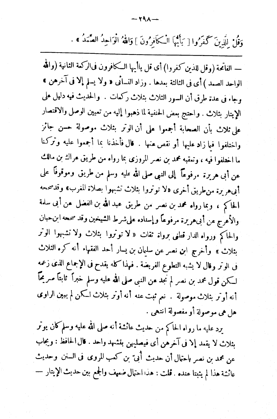 يَرُدُّ عَلَيْهِ مَا رَوَاهُ الْحَاكِم مِنْ حَدِيث عَائِشَةَ أَنَّهُ صَلَّى اللَّه عَلَيْهِ وَسَلَّمَ كَانَ يُوتِرُ بِثَلَاثٍ لَا يَقْعُدُ إِلَّا فِي آخِرِهِنَّ أَيْ فَيُصَلِّيهِنَّ بِتَشَهُّدٍ وَاحِدٍ . قَالَ الْحَافِظُ : وَيُجَابُ عَنْ مُحَمَّد بْن نَصْر بِاحْتِمَالِ أَنَّ حَدِيثَ أُبَيِّ بْن كَعْب الْمَرْوِيّ فِي السُّنَنِ وَحَدِيث عَائِشَة هَذَا لَمْ يَثْبُتَا عِنْدَهُ . قُلْت : هَذَا اِحْتِمَالٌ ضَعِيفٌ وَالْجَمْعُ بَيْن حَدِيث الْإِيتَار @