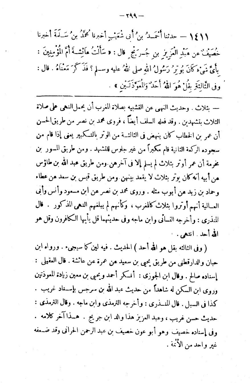 بِثَلَاثٍ . وَحَدِيث النَّهْيِ عَنْ التَّشْبِيهِ بِصَلَاةِ الْمَغْرِبِ أَنْ يُحْمَلَ النَّهْيُ عَلَى صَلَاةِ الثَّلَاثِ بِتَشَهُّدَيْنِ . وَقَدْ فَعَلَهُ السَّلَفُ أَيْضًا ، فَرَوَى مُحَمَّد بْن نَصْر مِنْ طَرِيق الْحَسَنِ أَنَّ عُمَرَ بْن الْخَطَّاب كَانَ يَنْهَضُ فِي الثَّالِثَة مِنْ الْوِتْرِ بِالتَّكْبِيرِ يَعْنِي إِذَا قَامَ مِنْ سُجُودِهِ الرَّكْعَةَ الثَّانِيَة قَامَ مُكَبِّرًا مِنْ غَيْر جُلُوسٍ لِلتَّشَهُّدِ . وَمِنْ طَرِيق الْمِسْوَرِ بْن مَخْرَمَةَ أَنَّ عُمَرَ أَوْتَرَ بِثَلَاثٍ لَمْ يُسَلِّمْ إِلَّا فِي آخِرِهِنَّ وَمَنْ طَرِيق عَبْد اللَّه بْن طَاوُوس عَنْ أَبِيهِ أَنَّهُ كَانَ يُوتِرُ بِثَلَاثٍ لَا يَقْعُدُ بَيْنَهُنَّ وَمَنْ طَرِيق قَيْس بْن سَعْد بْن عَطَاء وَحَمَّاد بْن زَيْد عَنْ أَيُّوبَ مِثْلُهُ . وَرَوَى مُحَمَّدُ بْنُ نَصْرٍ عَنْ اِبْن مَسْعُود وَأَنَسٍ وَأَبِي الْعَالِيَة أَنَّهُمْ أَوْتَرُوا بِثَلَاثٍ كَالْمَغْرِبِ ، وَكَأَنَّهُمْ لَمْ يَبْلُغْهُمْ النَّهْيُ الْمَذْكُورُ