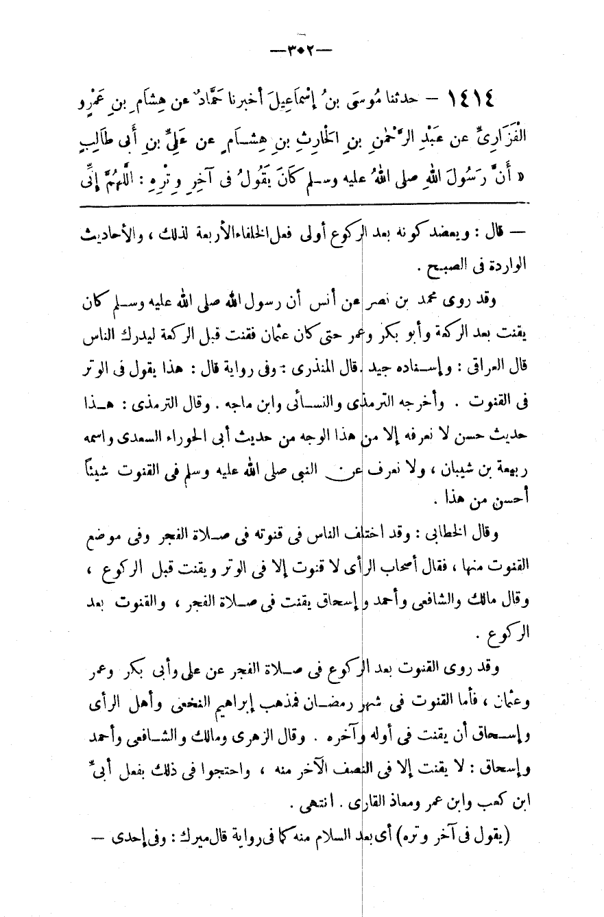 وَقَدْ رُوِيَ الْقُنُوتُ بَعْد الرُّكُوع فِي صَلَاة الْفَجْر عَنْ عَلِيّ وَأَبِي بَكْر وَعُمَر وَعُثْمَان ، فَأَمَّا الْقُنُوتُ فِي شَهْر رَمَضَان فَمَذْهَبُ إِبْرَاهِيم النَّخَعِيّ وَأَهْل الرَّأْي وَإِسْحَاق أَنْ يَقْنُتَ فِي أَوَّلِهِ وَآخِرِهِ . وَقَالَ الزُّهْرِيُّ وَمَالِك وَالشَّافِعِيّ وَأَحْمَد إِسْحَاق : لَا يَقْنُتُ إِلَّا فِي النِّصْفِ الْآخَر مِنْهُ ، وَاحْتَجُّوا فِي ذَلِكَ بِفِعْلِ أُبَيِّ بْن كَعْب وَابْن عُمَر وَمُعَاذ الْقَارِيّ . اِنْتَهَى .