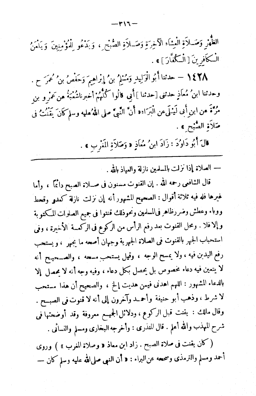 قَالَ الشَّافِعِيُّ رَحِمَهُ اللَّه : إِنَّ الْقُنُوت مَسْنُون فِي صَلَاة الصُّبْح دَائِمًا ، وَأَمَّا غَيْرهَا فَلَهُ فِيهِ ثَلَاثَة أَقْوَال : الصَّحِيح الْمَشْهُورُ أَنَّهُ إِنْ نَزَلَتْ نَازِلَة كَعَدُوٍّ وَقَحْط وَوَبَاء وَعَطَشٍ وَضَرَرٍ ظَاهِرٍ فِي الْمُسْلِمِينَ وَنَحْو ذَلِكَ قَنَتُوا فِي جَمِيع الصَّلَوَات الْمَكْتُوبَة وَإِلَّا فَلَا . وَمَحِلّ الْقُنُوت بَعْد رَفْع الرَّأْسِ مِنْ الرُّكُوع فِي الرَّكْعَة الْأَخِيرَة ، وَفِي اِسْتِحْبَاب الْجَهْرِ بِالْقُنُوتِ فِي الصَّلَاة الْجَهْرِيَّة وَجْهَانِ أَصَحُّهُ مَا يُجْهَرُ ، وَيُسْتَحَبُّ رَفْعُ الْيَدَيْنِ فِيهِ ، وَلَا يَمْسَحُ الْوَجْهَ ، وَقِيلَ يُسْتَحَبُّ مَسْحُهُ ، وَالصَّحِيح أَنَّهُ لَا يَتَعَيَّنُ فِيهِ دُعَاء مَخْصُوص بَلْ يَحْصُلُ بِكُلِّ دُعَاء ، وَفِيهِ وَجْهٌ أَنَّهُ لَا يَحْصُلُ إِلَّا بِالدُّعَاءِ الْمَشْهُور : اللَّهُمَّ اِهْدِنِي فِيمَنْ هَدَيْت إِلَخْ ، وَالصَّحِيح أَنَّ هَذَا مُسْتَحَبٌّ لَا شَرْط ، وَذَهَبَ أَبُو حَنِيفَة وَأَحْمَد وَآخَرُونَ إِلَى أَنَّهُ لَا قُنُوت فِي الصُّبْح . وَقَالَ مَالِك : يَقْنُتُ قَبْل الرُّكُوع ، وَدَلَائِل الْجَمِيع مَعْرُوفَة وَقَدْ أَوْضَحْتهَا فِي شَرْح الْمُهَذَّب وَاَللَّه أَعْلَم