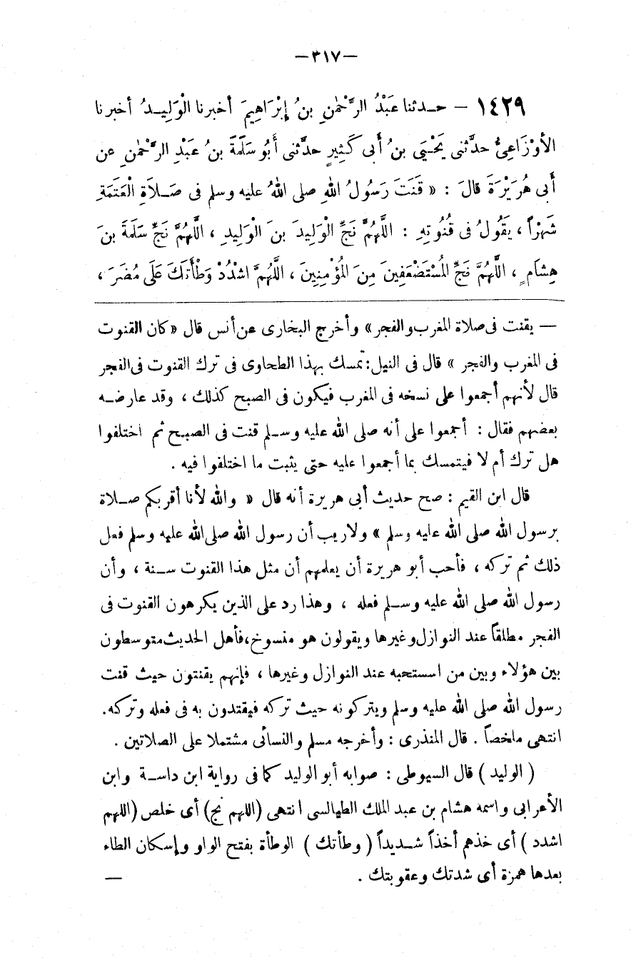 يَقْنُتُ فِي صَلَاة الْمَغْرِب وَالْفَجْر " وَأَخْرَجَ الْبُخَارِيّ عَنْ أَنَسٍ قَالَ : " كَانَ الْقُنُوت فِي الْمَغْرِب وَالْفَجْر " قَالَ فِي النَّيْل : تَمَسَّكَ بِهَذَا الطَّحَاوِيُّ فِي تَرْك الْقُنُوت فِي الْفَجْر قَالَ لِأَنَّهُمْ أَجْمَعُوا عَلَى نَسْخه فِي الْمَغْرِب فَيَكُونُ فِي الصُّبْح كَذَلِكَ ، وَقَدْ عَارَضَهُ بَعْضهمْ فَقَالَ : أَجْمَعُوا عَلَى أَنَّهُ صَلَّى اللَّه عَلَيْهِ وَسَلَّمَ قَنَتَ فِي الصُّبْح ثُمَّ اِخْتَلَفُوا هَلْ تَرَكَ أَمْ لَا فَيُتَمَسَّكُ بِمَا أَجْمَعُوا عَلَيْهِ حَتَّى يَثْبُتَ مَا اِخْتَلَفُوا فِيهِ .