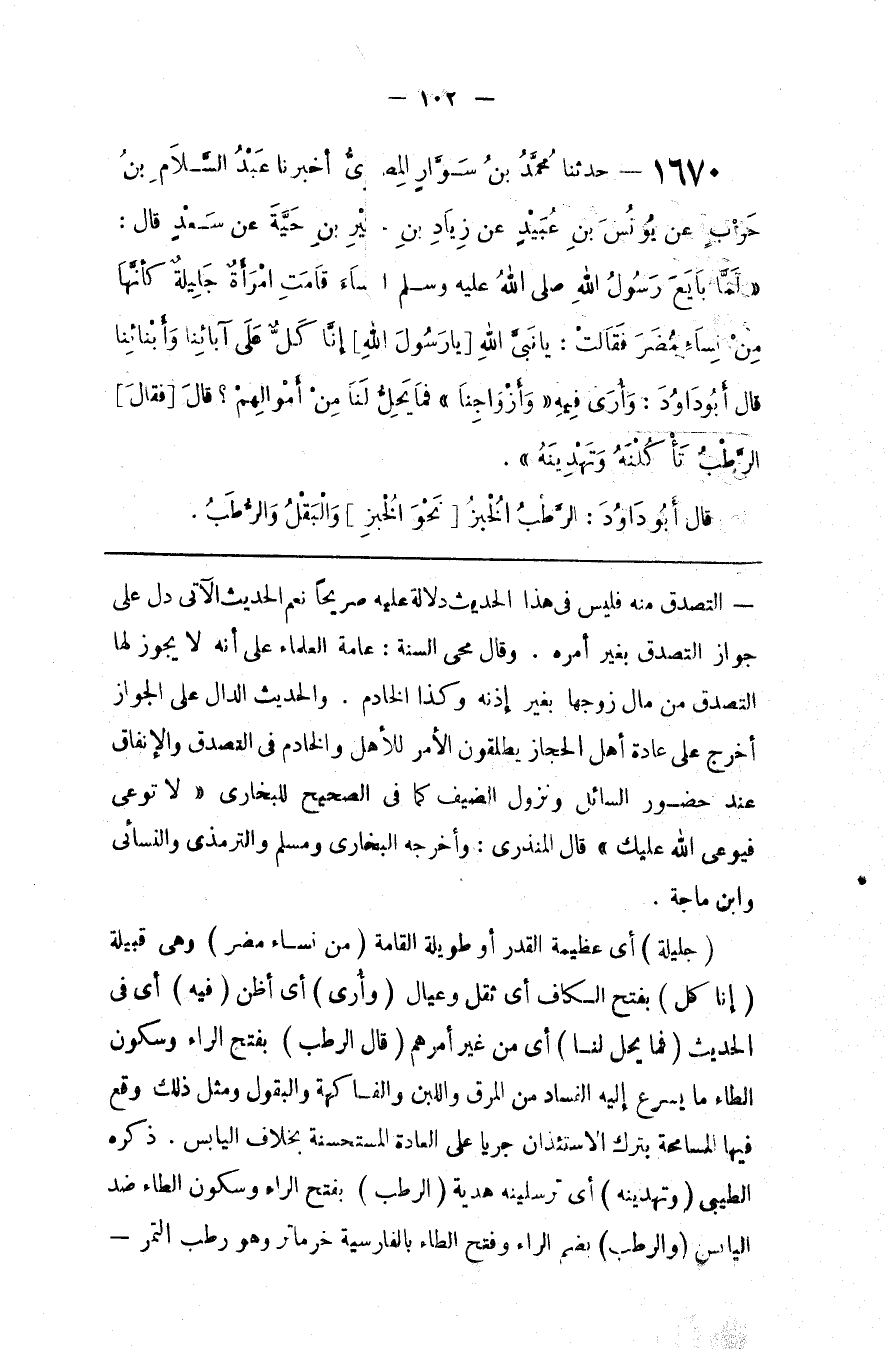 التَّصَدُّق مِنْهُ فَلَيْسَ فِي هَذَا الْحَدِيث دَلَالَة عَلَيْهِ صَرِيحًا نَعَمْ الْحَدِيث الْآتِي دَلَّ عَلَى جَوَاز التَّصَدُّق بِغَيْرِ أَمْره . وَقَالَ مُحْيي السُّنَّة : عَامَّة الْعُلَمَاء عَلَى أَنَّهُ لَا يَجُوز لَهَا التَّصَدُّق مِنْ مَال زَوْجهَا بِغَيْرِ إِذْنه وَكَذَا الْخَادِم . وَالْحَدِيث الدَّال عَلَى الْجَوَاز أُخْرِج عَلَى عَادَة أَهْل الْحِجَاز يُطْلِقُونَ الْأَمْر لِلْأَهْلِ وَالْخَادِم فِي التَّصَدُّق وَالْإِنْفَاق عِنْد حُضُور السَّائِل وَنُزُول الضَّيْف كَمَا فِي الصَّحِيح لِلْبُخَارِيِّ " لَا تُوعِي فَيُوعِيَ اللَّه عَلَيْك " قَالَ الْمُنْذِرِيّ : وَأَخْرَجَهُ الْبُخَارِيّ وَمُسْلِم وَالتِّرْمِذِيّ وَالنَّسَائِيُّ وَابْن مَاجَهْ .