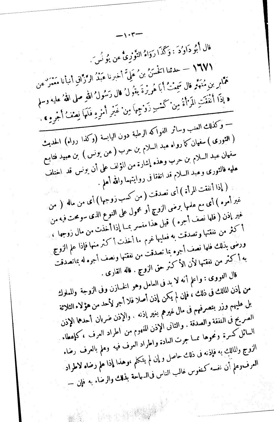 : قِيلَ هَذَا مُفَسَّر بِمَا إِذَا أَخَذَتْ مِنْ مَال زَوْجهَا ، أَكْثَر مِنْ نَفَقَتهَا وَتَصَدَّقَتْ بِهِ فَعَلَيْهَا غُرْم مَا أَخَذَتْ أَكْثَر مِنْهَا فَإِذَا عَلِمَ الزَّوْج وَرَضِيَ بِذَلِكَ فَلَهَا نِصْف أَجْره بِمَا تَصَدَّقَتْ مِنْ نَفَقَتهَا وَنِصْف أَجْره لَهُ بِمَا تَصَدَّقَتْ بِهِ أَكْثَر مِنْ نَفَقَتهَا لِأَنَّ الْأَكْثَر حَقّ الزَّوْج . قَالَهُ الْقَارِي .