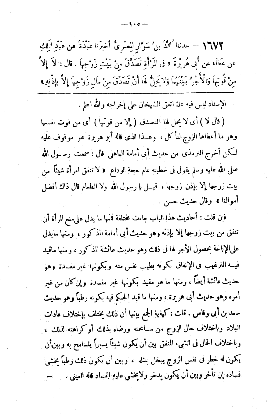 فَإِنْ قُلْت : أَحَادِيث هَذَا الْبَاب جَاءَتْ مُخْتَلِفَة فَمِنْهَا مَا يَدُلّ عَلَى مَنْع الْمَرْأَة أَنْ تُنْفِق مِنْ بَيْت زَوْجهَا إِلَّا بِإِذْنِهِ وَهُوَ حَدِيث أَبِي أُمَامَةَ الْمَذْكُور ، وَمِنْهَا مَا يَدُلّ عَلَى الْإِبَاحَة بِحُصُولِ الْأَجْر لَهَا فِي ذَلِكَ وَهُوَ حَدِيث عَائِشَة الْمَذْكُور ، وَمِنْهَا مَا قُيِّدَ فِيهِ التَّرْغِيب فِي الْإِنْفَاق بِكَوْنِهِ بِطِيبِ نَفْس مِنْهُ وَبِكَوْنِهَا غَيْر مُفْسِدَة وَهُوَ حَدِيث عَائِشَة أَيْضًا ، وَمِنْهَا مَا هُوَ مُقَيَّد بِكَوْنِهَا غَيْر مُفْسِدَة وَإِنْ كَانَ مِنْ غَيْر أَمْره وَهُوَ حَدِيث أَبِي هُرَيْرَة ، وَمِنْهَا مَا قُيِّدَ الْحَكَم فِيهِ بِكَوْنِهِ رَطْبًا وَهُوَ حَدِيث سَعْد بْن أَبِي وَقَّاص .