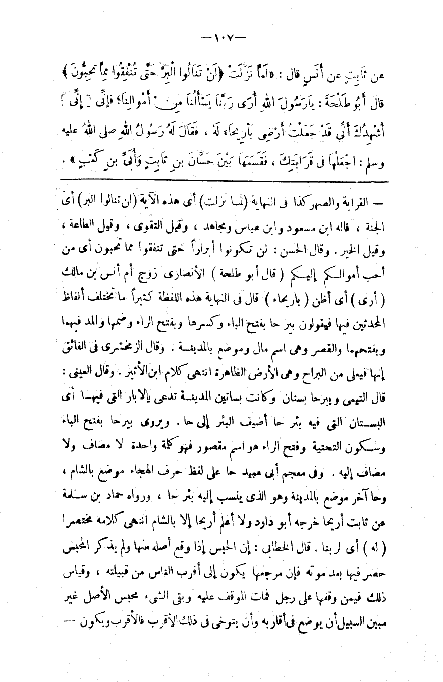 : قَالَ فِي النِّهَايَة هَذِهِ اللَّفْظَة كَثِيرًا مَا تَخْتَلِف أَلْفَاظ الْمُحَدِّثِينَ فِيهَا فَيَقُولُونَ بَيْرُحَا بِفَتْحِ الْبَاء وَكَسْرهَا وَبِفَتْحِ الرَّاء وَضَمّهَا وَالْمَدّ فِيهِمَا وَبِفَتْحِهِمَا وَالْقَصْر وَهِيَ اِسْم مَال وَمَوْضِع بِالْمَدِينَةِ . وَقَالَ الزَّمَخْشَرِيّ فِي الْفَائِق إِنَّهَا فَيْعُلَى مِنْ الْبَرَاح وَهِيَ الْأَرْض الظَّاهِرَة اِنْتَهَى كَلَام اِبْن الْأَثِير . وَقَالَ الْعَيْنِيّ : قَالَ التَّيْمِيُّ وَبَيْرُحَا بُسْتَان وَكَانَتْ بَسَاتِين الْمَدِينَة تُدْعَى بِالْآبَارِ الَّتِي فِيهَا أَيْ الْبُسْتَان الَّتِي فِيهِ بِئْر حَا أُضِيف الْبِئْر إِلَى حَا . وَيُرْوِي بَيْرَحَا بِفَتْحِ الْبَاء وَسُكُون التَّحْتِيَّة وَفَتْح الرَّاء هُوَ اِسْم مَقْصُور فَهُوَ كَلِمَة وَاحِدَة لَا مُضَاف وَلَا مُضَاف إِلَيْهِ . وَفِي مُعْجَم أَبِي عُبَيْد حَا عَلَى لَفْظ حَرْف الْهِجَاء مَوْضِع بِالشَّامِ ، وَحَا آخِر مَوْضِع بِالْمَدِينَةِ وَهُوَ الَّذِي يُنْسَب إِلَيْهِ بِئْر حَا ، وَرَوَاهُ حَمَّاد بْن سَلَمَة عَنْ ثَابِت أَرِيحَا خَرَّجَهُ أَبُو دَاوُدَ وَلَا أَعْلَم أَرِيحَا إِلَّا بِالشَّامِ اِنْتَهَى كَلَامه مُخْتَصَرًا