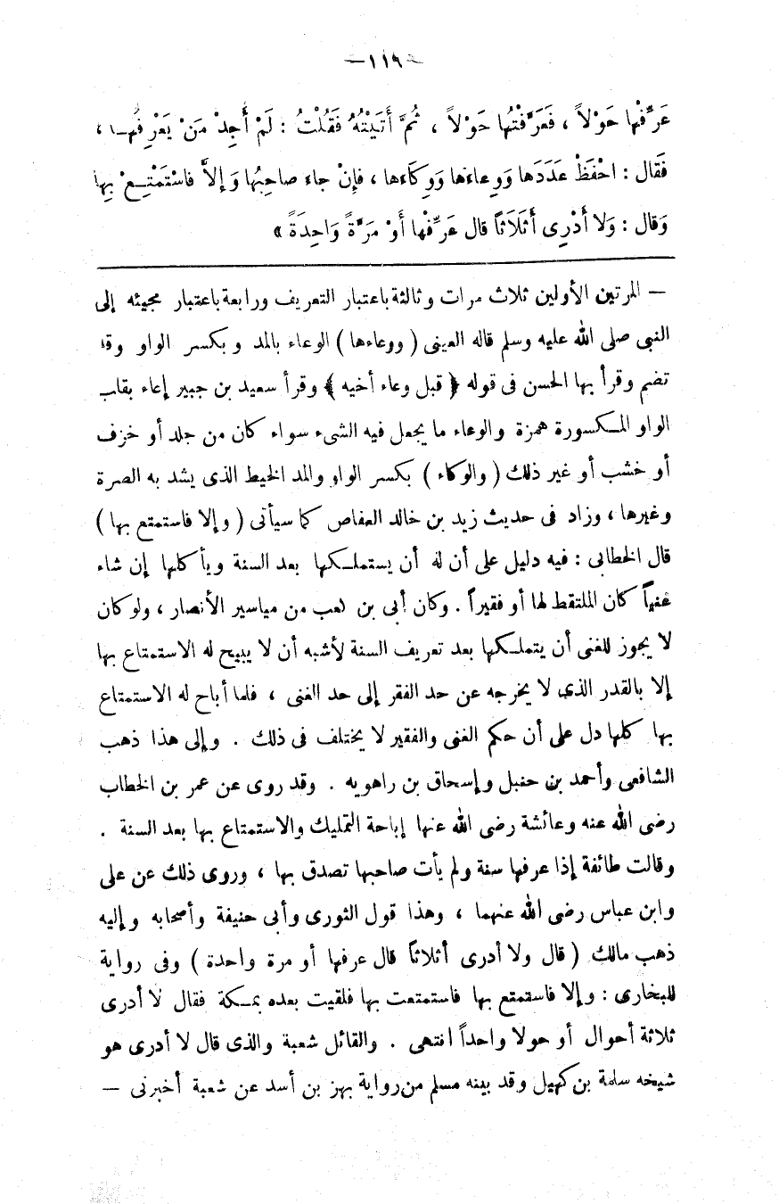 : قَالَ الْخَطَّابِيُّ : فِيهِ دَلِيل عَلَى أَنَّ لَهُ أَنْ يَسْتَمْلِكهَا بَعْد السَّنَة وَيَأْكُلهَا إِنْ شَاءَ غَنِيًّا كَانَ الْمُلْتَقِط لَهَا أَوْ فَقِيرًا . وَكَانَ أُبَيُّ بْن كَعْب مِنْ مَيَاسِير الْأَنْصَار ، وَلَوْ كَانَ لَا يَجُوز لِلْغَنِيِّ أَنْ يَتَمَلَّكهَا بَعْد تَعْرِيف السَّنَة لَأَشْبَهَ أَنْ لَا يُبِيح لَهُ الِاسْتِمْتَاع بِهَا إِلَّا بِالْقَدْرِ الَّذِي لَا يُخْرِجهُ عَنْ حَدّ الْفَقْر إِلَى حَدّ الْغِنَى ، فَلَمَّا أَبَاحَ لَهُ الِاسْتِمْتَاع بِهَا كُلّهَا دَلَّ عَلَى أَنَّ حُكْم الْغَنِيّ وَالْفَقِير لَا يَخْتَلِف فِي ذَلِكَ . وَإِلَى هَذَا ذَهَبَ الشَّافِعِيّ وَأَحْمَد بْن حَنْبَل وَإِسْحَاق بْن رَاهْوَيْهِ . وَقَدْ رُوِيَ عَنْ عُمَر بْن الْخَطَّاب رَضِيَ اللَّه عَنْهُ وَعَائِشَة رَضِيَ اللَّه عَنْهَا إِبَاحَة التَّمْلِيك وَالِاسْتِمْتَاع بِهَا بَعْد السَّنَة . وَقَالَتْ طَائِفَة إِذَا عَرَّفَهَا سَنَة وَلَمْ يَأْتِ صَاحِبهَا تَصَدَّقَ بِهَا ، وَرُوِيَ ذَلِكَ عَنْ عَلِيّ وَابْن عَبَّاس ، وَهَذَا قَوْل الثَّوْرِيّ وَأَبِي حَنِيفَة وَأَصْحَابه وَإِلَيْهِ ذَهَبَ مَالِك