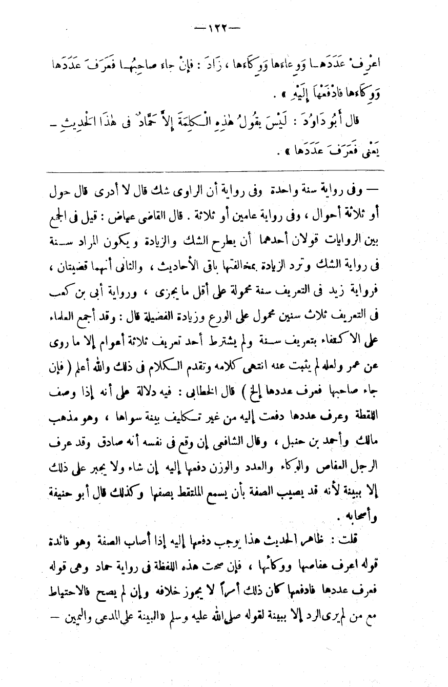 قُلْت : ظَاهِر الْحَدِيث هَذَا يُوجِب دَفْعهَا إِلَيْهِ إِذَا أَصَابَ الصِّفَة وَهُوَ فَائِدَة قَوْله اِعْرِفْ عِفَاصهَا وَوِكَاءَهَا ، فَإِنْ صَحَّتْ هَذِهِ اللَّفْظَة فِي رِوَايَة حَمَّاد وَهِيَ قَوْله فَعَرِّفْ عَدَدهَا فَادْفَعْهَا كَانَ ذَلِكَ أَمْرًا لَا يَجُوز خِلَافه وَإِنْ لَمْ يَصِحّ فَالِاحْتِيَاط مَعَ مَنْ لَمْ يَرَى الرَّدّ إِلَّا بِبَيِّنَةٍ لِقَوْلِهِ صَلَّى اللَّه عَلَيْهِ وَسَلَّمَ : " الْبَيِّنَة عَلَى الْمُدَّعِي وَالْيَمِين @