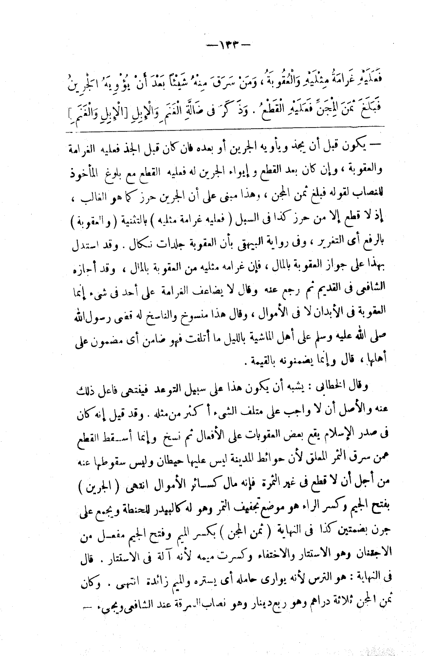 وَقَالَ الْخَطَّابِيُّ : يُشْبِه أَنْ يَكُون هَذَا عَلَى سَبِيل التَّوَعُّد فَيَنْتَهِي فَاعِل ذَلِكَ عَنْهُ وَالْأَصْل أَنْ لَا وَاجِب عَلَى مُتْلِف الشَّيْء أَكْثَر مِنْ مِثْله . وَقَدْ قِيلَ إِنَّهُ كَانَ فِي صَدْر الْإِسْلَام يَقَع بَعْض الْعُقُوبَات عَلَى الْأَفْعَال ثُمَّ نُسِخَ وَإِنَّمَا أُسْقِط الْقَطْع عَمَّنْ سَرَقَ الثَّمَر الْمُعَلَّق لِأَنَّ حَوَائِط الْمَدِينَة لَيْسَ عَلَيْهَا حِيطَان وَلَيْسَ سُقُوطُهَا عَنْهُ مِنْ أَجْل أَنْ لَا قَطْع فِي غَيْر الثَّمَرَة فَإِنَّهُ مَال كَسَائِرِ الْأَمْوَال اِنْتَهَى