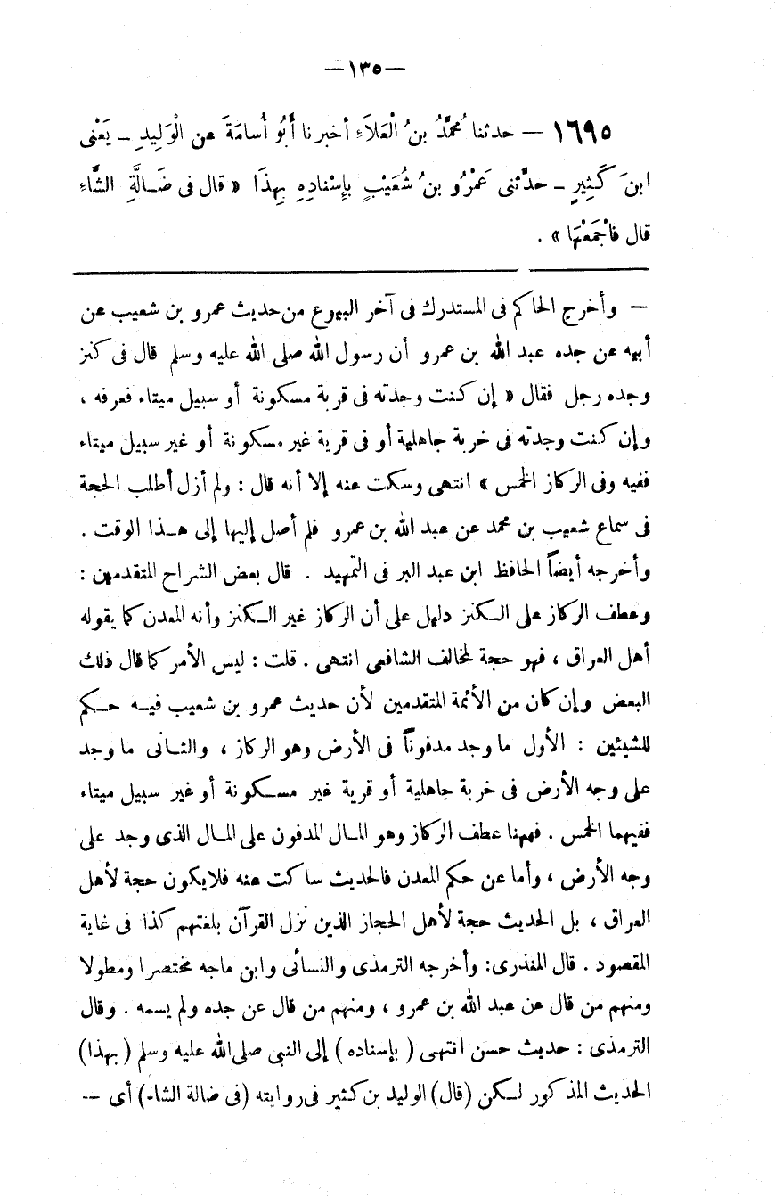 وَأَخْرَجَ الْحَاكِم فِي الْمُسْتَدْرَك فِي آخِر الْبُيُوع مِنْ حَدِيث عَمْرو بْن شُعَيْب عَنْ أَبِيهِ عَنْ جَدّه عَبْد اللَّه بْن عَمْرو أَنَّ رَسُول اللَّه صَلَّى اللَّه عَلَيْهِ وَسَلَّمَ قَالَ فِي كَنْز وَجَدَهُ رَجُل فَقَالَ : " إِنْ كُنْت وَجَدْته فِي قَرْيَة مَسْكُونَة أَوْ سَبِيل مِيتَاء فَعَرِّفْهُ ، وَإِنْ كُنْت وَجَدْته فِي خَرِبَة جَاهِلِيَّة أَوْ فِي قَرْيَة غَيْر مَسْكُونَة أَوْ غَيْر سَبِيل مِيتَاء فَفِيهِ وَفِي الرِّكَاز الْخُمُس " اِنْتَهَى وَسَكَتَ عَنْهُ إِلَّا أَنَّهُ قَالَ : وَلَمْ أَزَل أَطْلُب الْحُجَّة فِي سَمَاع شُعَيْب بْن مُحَمَّد بْن عَبْد اللَّه بْن عَمْرو فَلَمْ أَصِل إِلَيْهَا إِلَى هَذَا الْوَقْت . وَأَخْرَجَهُ أَيْضًا الْحَافِظ اِبْن عَبْد الْبَرّ فِي التَّمْهِيد . قَالَ بَعْض الشُّرَّاح الْمُتَقَدِّمِينَ : وَعَطْف الرِّكَاز عَلَى الْكَنْز دَلِيل عَلَى أَنَّ الرِّكَاز غَيْر الْكَنْز وَأَنَّهُ الْمَعْدِن كَمَا يَقُولهُ أَهْل الْعِرَاق ، فَهُوَ حُجَّة لِمُخَالِفِ الشَّافِعِيّ اِنْتَهَى .
