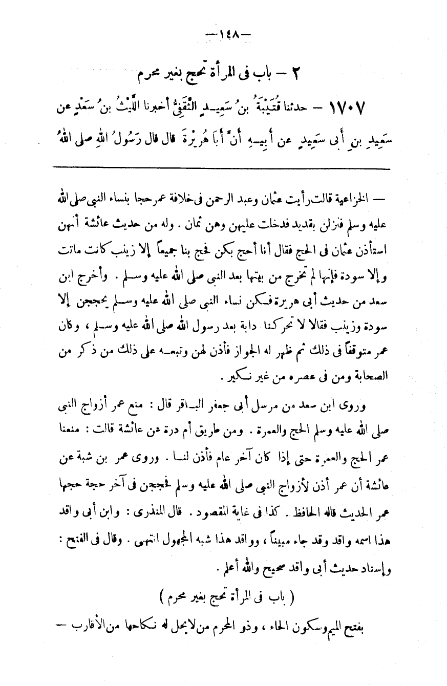 وَلَهُ مِنْ حَدِيث عَائِشَة أَنَّهُنَّ اِسْتَأْذَنَّ عُثْمَان فِي الْحَجّ فَقَالَ أَنَا أَحُجّ بِكُنَّ فَحَجَّ بِنَا جَمِيعًا إِلَّا زَيْنَب كَانَتْ مَاتَتْ وَإِلَّا سَوْدَة فَإِنَّهَا لَمْ تَخْرُج مِنْ بَيْتهَا بَعْد النَّبِيّ صَلَّى اللَّه عَلَيْهِ وَسَلَّمَ وَأَخْرَجَ اِبْن سَعْد مِنْ حَدِيث أَبِي هُرَيْرَة فَكُنَّ نِسَاء النَّبِيّ صَلَّى اللَّه عَلَيْهِ وَسَلَّمَ يَحْجُجْنَ إِلَّا سَوْدَة وَزَيْنَب فَقَالَا لَا تُحَرِّكنَا دَابَّة بَعْد رَسُول اللَّه صَلَّى اللَّه عَلَيْهِ وَسَلَّمَ ، وَكَانَ عُمَر مُتَوَقِّفًا فِي ذَلِكَ ثُمَّ ظَهَرَ لَهُ الْجَوَاز فَأَذِنَ لَهُنَّ وَتَبِعَهُ عَلَى ذَلِكَ مَنْ ذُكِرَ مِنْ الصَّحَابَة وَمَنْ فِي عَصْره مِنْ غَيْر نَكِير .
