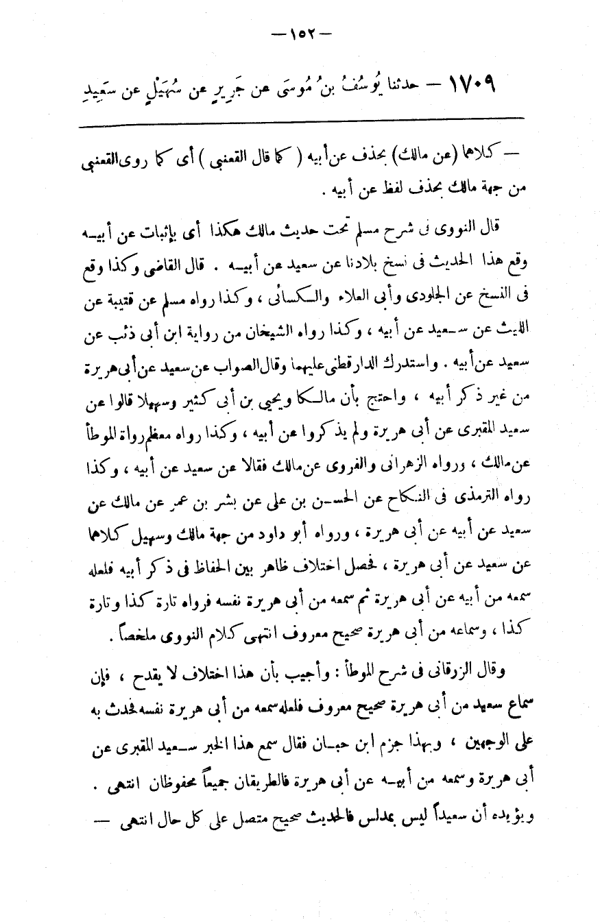 وَقَالَ الزُّرْقَانِيّ فِي شَرْح الْمُوَطَّأ : وَأُجِيبَ بِأَنَّ هَذَا اِخْتِلَاف لَا يَقْدَح ، فَإِنَّ سَمَاع سَعِيد مِنْ أَبِي هُرَيْرَة صَحِيح مَعْرُوف فَلَعَلَّهُ سَمِعَهُ مِنْ أَبِي هُرَيْرَة نَفْسه فَحَدَّثَ بِهِ عَلَى الْوَجْهَيْنِ ، وَبِهَذَا اِبْن حِبَّان فَقَالَ سَمِعَ هَذَا الْخَبَر سَعِيد الْمَقْبُرِيُّ عَنْ أَبِي هُرَيْرَة وَسَمِعَهُ مِنْ أَبِيهِ عَنْ أَبِي هُرَيْرَة فَالطَّرِيقَانِ جَمِيعًا مَحْفُوظَانِ اِنْتَهَى . وَيُؤَيِّدهُ أَنَّ سَعِيدًا لَيْسَ بِمُدَلِّسٍ فَالْحَدِيث صَحِيح عَلَى كُلّ حَال اِنْتَهَى .@
