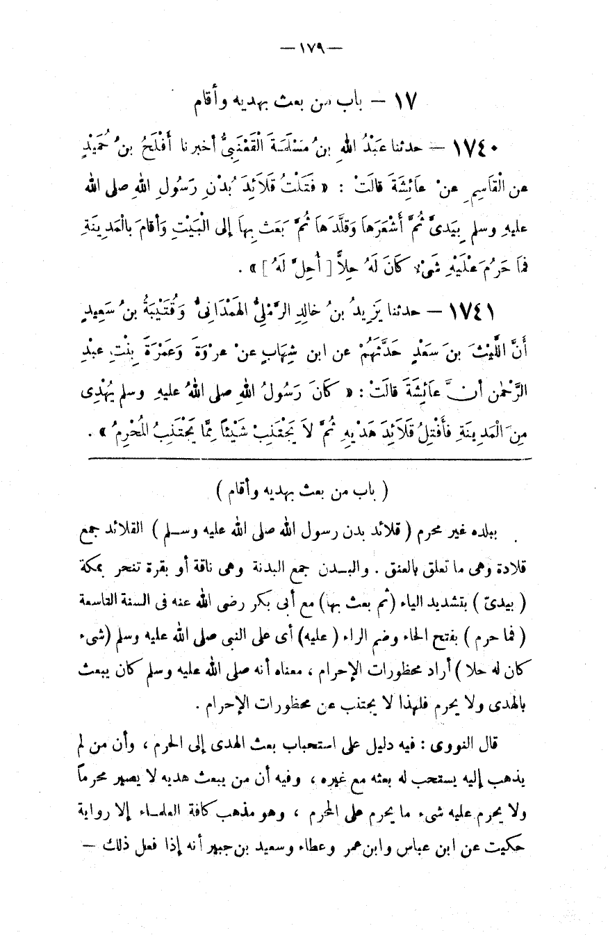 قَالَ النَّوَوِيّ : فِيهِ دَلِيل عَلَى اِسْتِحْبَاب بَعْث الْهَدْي إِلَى الْحَرَم ، وَأَنَّ مَنْ لَمْ يَذْهَب إِلَيْهِ يُسْتَحَبّ لَهُ بَعْثه مَعَ غَيْره ، وَفِيهِ أَنَّ مَنْ يَبْعَث هَدْيه لَا يَصِير مُحْرِمًا وَلَا يَحْرُم عَلَيْهِ شَيْء مَا يَحْرُم عَلَى الْمُحْرِم ، وَهُوَ مَذْهَب كَافَّة الْعُلَمَاء إِلَّا رِوَايَة حُكِيَتْ عَنْ اِبْن عَبَّاس وَابْن عُمَر وَعَطَاء وَسَعِيد بْن جُبَيْر أَنَّهُ إِذَا فَعَلَ ذَلِكَ@
