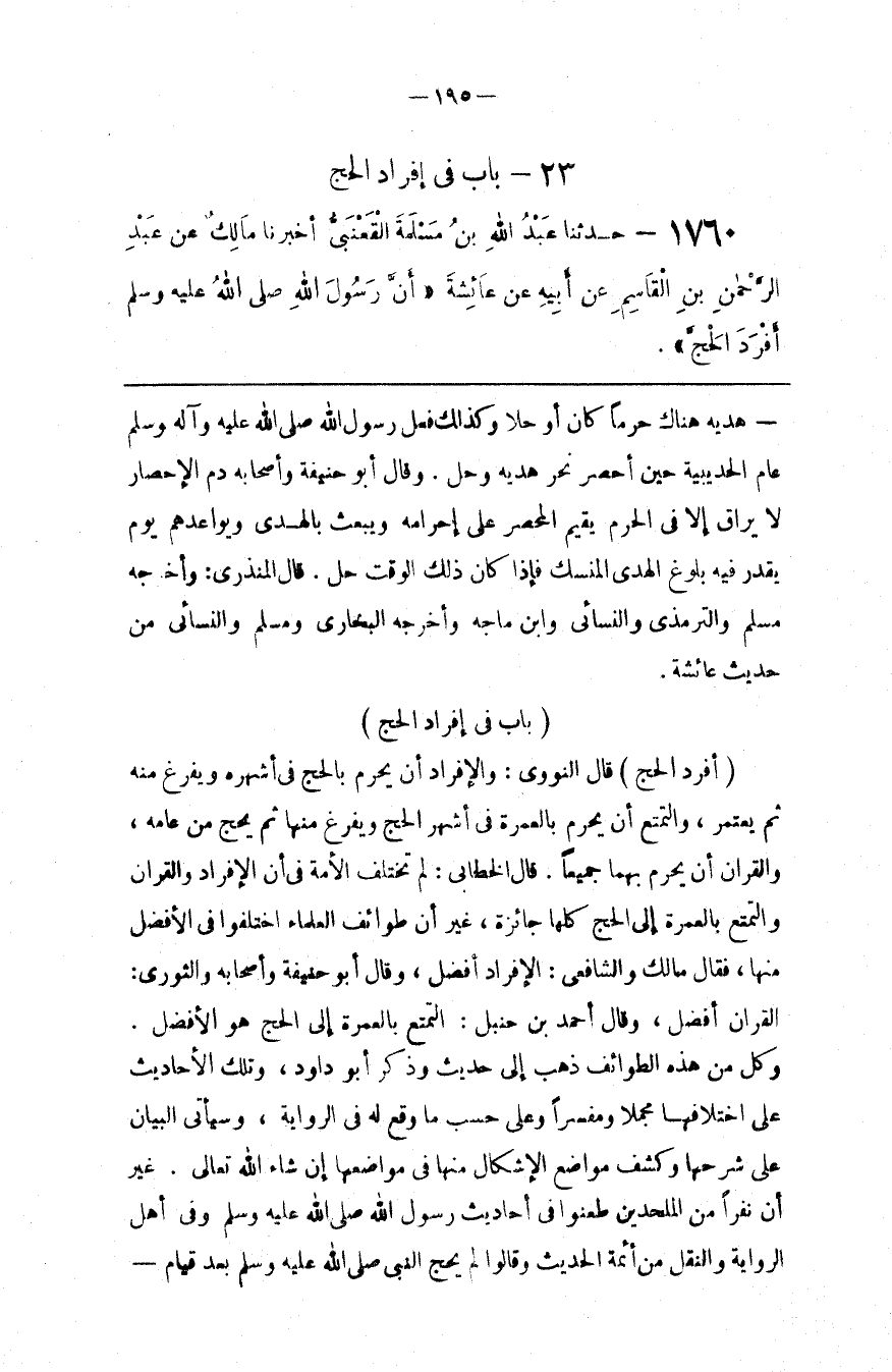 : قَالَ النَّوَوِيّ : وَالْإِفْرَاد أَنْ يُحْرِم بِالْحَجِّ فِي أَشْهُره وَيَفْرُغ مِنْهُ ثُمَّ يَعْتَمِر ، وَالتَّمَتُّع أَنْ يُحْرِم بِالْعُمْرَةِ فِي أَشْهُر الْحَجّ وَيَفْرُغ مِنْهَا ثُمَّ يَحُجّ مِنْ عَامه ، وَالْقِرَان أَنْ يُحْرِم بِهِمَا جَمِيعًا . قَالَ الْخَطَّابِيُّ : لَمْ تَخْتَلِف الْأُمَّة فِي أَنَّ الْإِفْرَاد وَالْقِرَان وَالتَّمَتُّع بِالْعُمْرَةِ إِلَى الْحَجّ كُلّهَا حَادِثَة ، غَيْر أَنَّ طَوَائِف الْعُلَمَاء اِخْتَلَفُوا فِي الْأَفْضَل مِنْهَا ، فَقَالَ مَالِك وَالشَّافِعِيّ : الْإِفْرَاد أَفْضَل ، وَقَالَ أَبُو حَنِيفَة وَأَصْحَابه وَالثَّوْرِيّ : الْقِرَان أَفْضَل ، وَقَالَ أَحْمَد بْن حَنْبَل : التَّمَتُّع بِالْعُمْرَةِ إِلَى الْحَجّ هُوَ الْأَفْضَل . وَكُلّ مِنْ هَذِهِ الطَّوَائِف ذَهَبَ إِلَى حَدِيث وَذَكَرَ أَبُو دَاوُدَ ، وَتِلْكَ الْأَحَادِيث عَلَى اِخْتِلَافهَا مُجْمَلًا وَمُفَسَّرًا وَعَلَى حَسَب مَا وَقَعَ لَهُ فِي الرِّوَايَة ، وَسَيَأْتِي الْبَيَان عَلَى شَرْحهَا وَكَشْف مَوَاضِع الْإِشْكَال مِنْهَا فِي مَوَاضِعهَا إِنْ شَاءَ اللَّه تَعَالَى . غَيْر أَنَّ نَفَرًا مِنْ الْمُلْحِدِينَ طَعَنُوا فِي أَحَادِيث رَسُول اللَّه صَلَّى اللَّه عَلَيْهِ وَسَلَّمَ وَفِي أَهْل الرِّوَايَة وَالنَّقْل مِنْ أَئِمَّة الْحَدِيث وَقَالُوا لَمْ يَحُجّ النَّبِيّ صَلَّى اللَّه عَلَيْهِ وَسَلَّمَ بَعْد قِيَام@