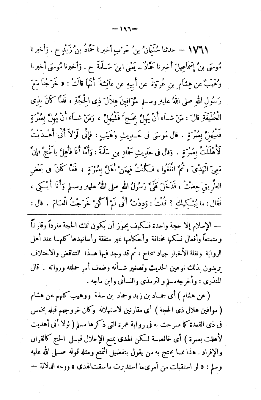 الْإِسْلَام إِلَّا حَجَّة وَاحِدَة فَكَيْف يَجُوز أَنْ يَكُون تِلْكَ الْحَجَّة مُفْرِدًا وَقَارِنًا وَمُتَمَتِّعًا وَأَفْعَال نُسُكهَا مُخْتَلِفَة وَأَحْكَامهَا غَيْر مُتَّفِقَة وَأَسَانِيدهَا كُلّهَا عِنْد أَهْل الرِّوَايَة وَنَقَلَة الْأَخْبَار جِيَاد صِحَاح ، ثُمَّ قَدْ وُجِدَ فِيهَا هَذَا التَّنَاقُض وَالِاخْتِلَاف يُرِيدُونَ بِذَلِكَ تَوْهِين الْحَدِيث وَتَصْغِير شَأْنه وَضَعْف أَمْر حَمَلَتِه وَرُوَاته . قَالَ الْمُنْذِرِيّ : وَأَخْرَجَهُ مُسْلِم وَالتِّرْمِذِيّ وَالنَّسَائِيُّ وَابْن مَاجَهْ .