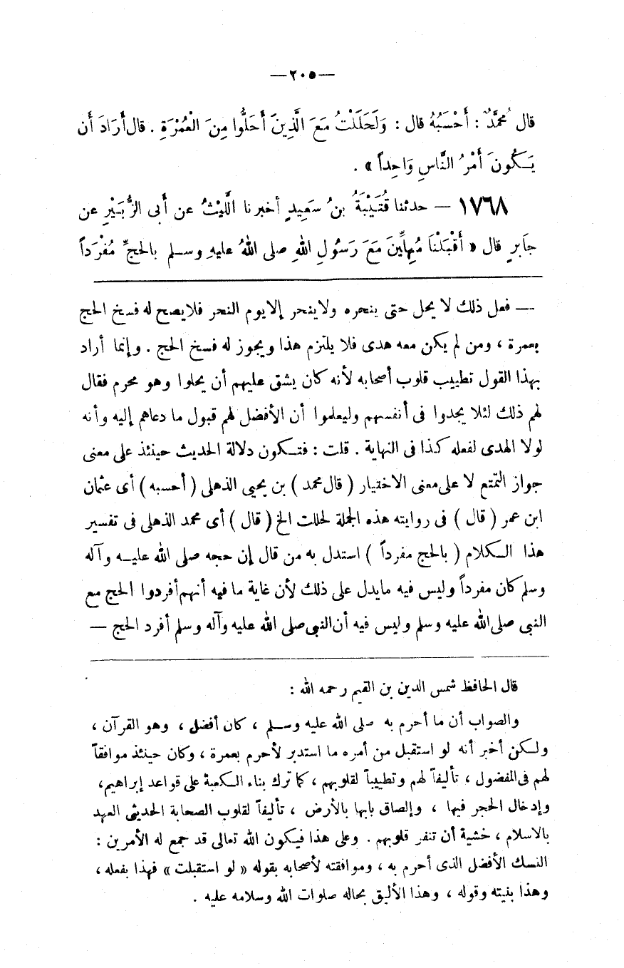 قال الحافظ شمس الدين بن القيم رحمه الله والصواب أن ما أحرم به صلى الله عليه و سلم كان أفضل وهو القرآن ولكن أخبر أنه لو استقبل من أمره ما استدبر لأحرم بعمرة وكان حينئذ موافقا لهم في المفضول تأليفا لهم وتطييبا لقلوبهم كما ترك بناء الكعبة على قواعد إبراهيم وإدخال الحجر فيها وإلصاق بابها بالأرض تأليفا لقلوب الصحابة الحديثي العهد بالإسلام خشية أن تنفر قلوبهم