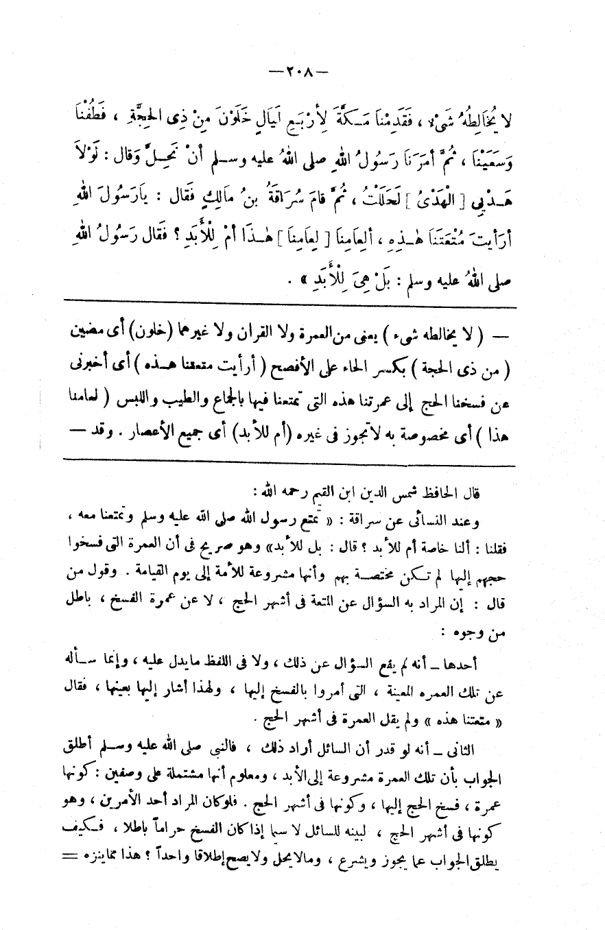 قال الحافظ شمس الدين بن القيم رحمه الله وعند النسائي عن سراقة تمتع رسول الله وتمتعنا معه فقلنا ألنا خاصة أم للأبد قال بل للأبد وهو صريح في أن العمرة التي فسخوا حجهم إليها لم تكن مختصة بهم وأنها مشروعة للأمة إلى يوم القيامة