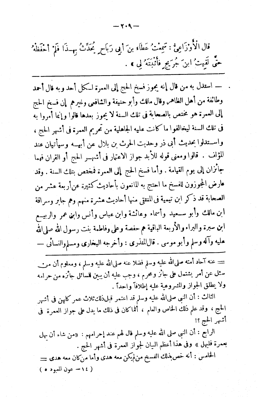 الثالث أن النبي قد اعتمر قبل ذلك ثلاث عمر كلهن في أشهر الحج وقد علم ذلك الخاص والعام أفما كان في ذلك ما يدل على جواز العمرة في أشهر الحج الرابع أن النبي قال لهم عند إحرامهم من شاء أن يهل بعمرة فليهل وفي هذا أعظم البيان لجواز العمرة في أشهر الحج