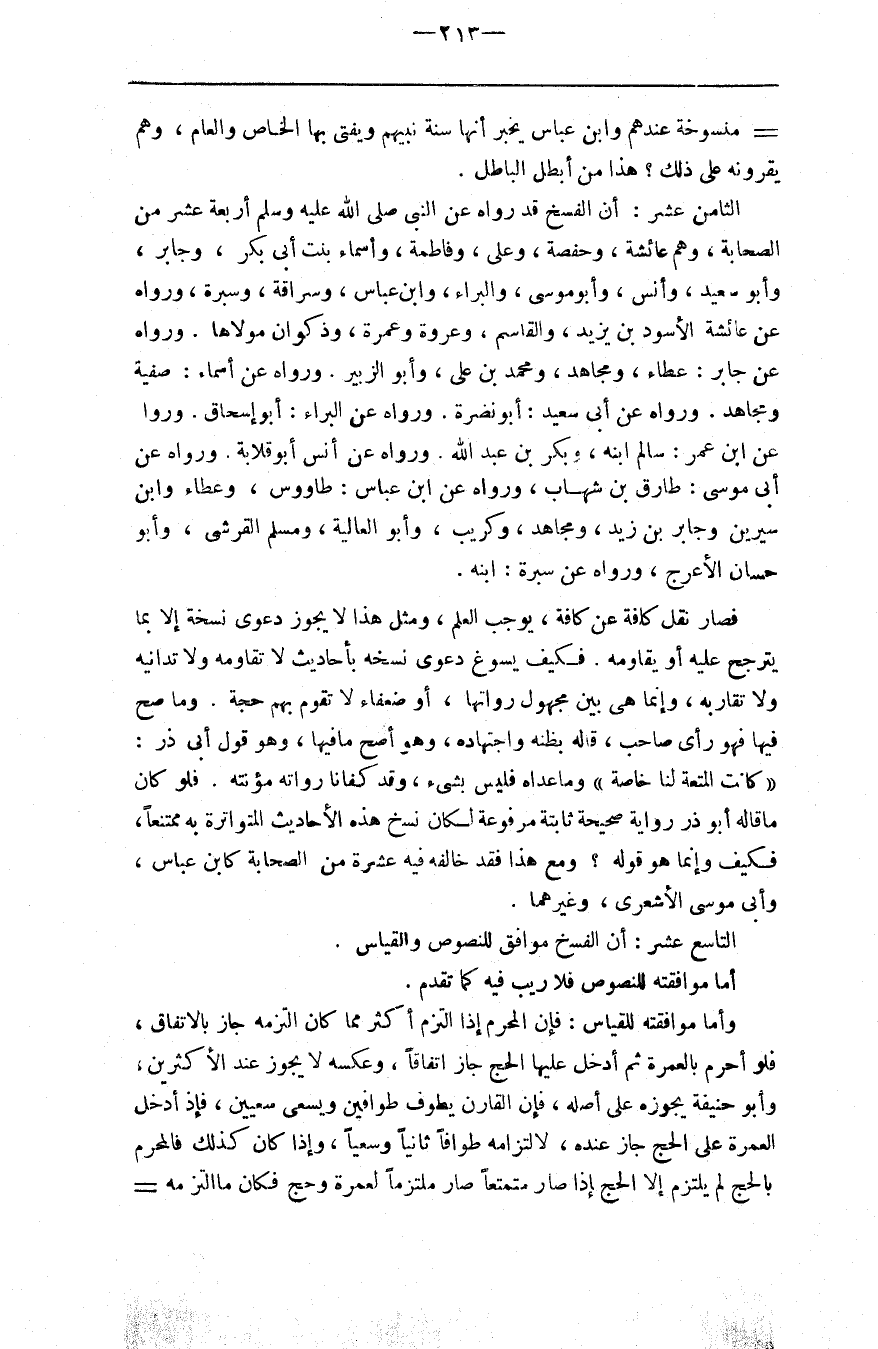 الثامن عشر أن الفسخ قد رواه عن النبي أربعة عشر من الصحابة وهم عائشة وحفصة وعلي وفاطمة وأسماء بنت أبي بكر وجابر وأبو سعيد وأنس وأبو موسى والبراء وابن عباس وسراقة وسبرة ورواه عن عائشة الأسود بن يزيد والقاسم وعروة وعمرة وذكوان مولاها