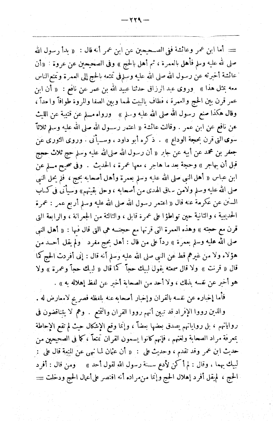 والذين رووا الإفراد قد تبين أنهم رووا القران والتمتع وهم لا يتناقضون في رواياتهم بل رواياتهم يصدق بعضها بعضا وإنما وقع الإشكال حيث لم تقع الإحاطة بمعرفة مراد الصحابة ولغتهم فإنهم كانوا يسمون القران تمتعا كما في الصحيحين من حديث ابن عمر وقد تقدم وحديث علي أن عثمان لما نهى عن المتعة قال علي لبيك بهما وقال لم أكن لأدع سنة رسول الله لقول أحد