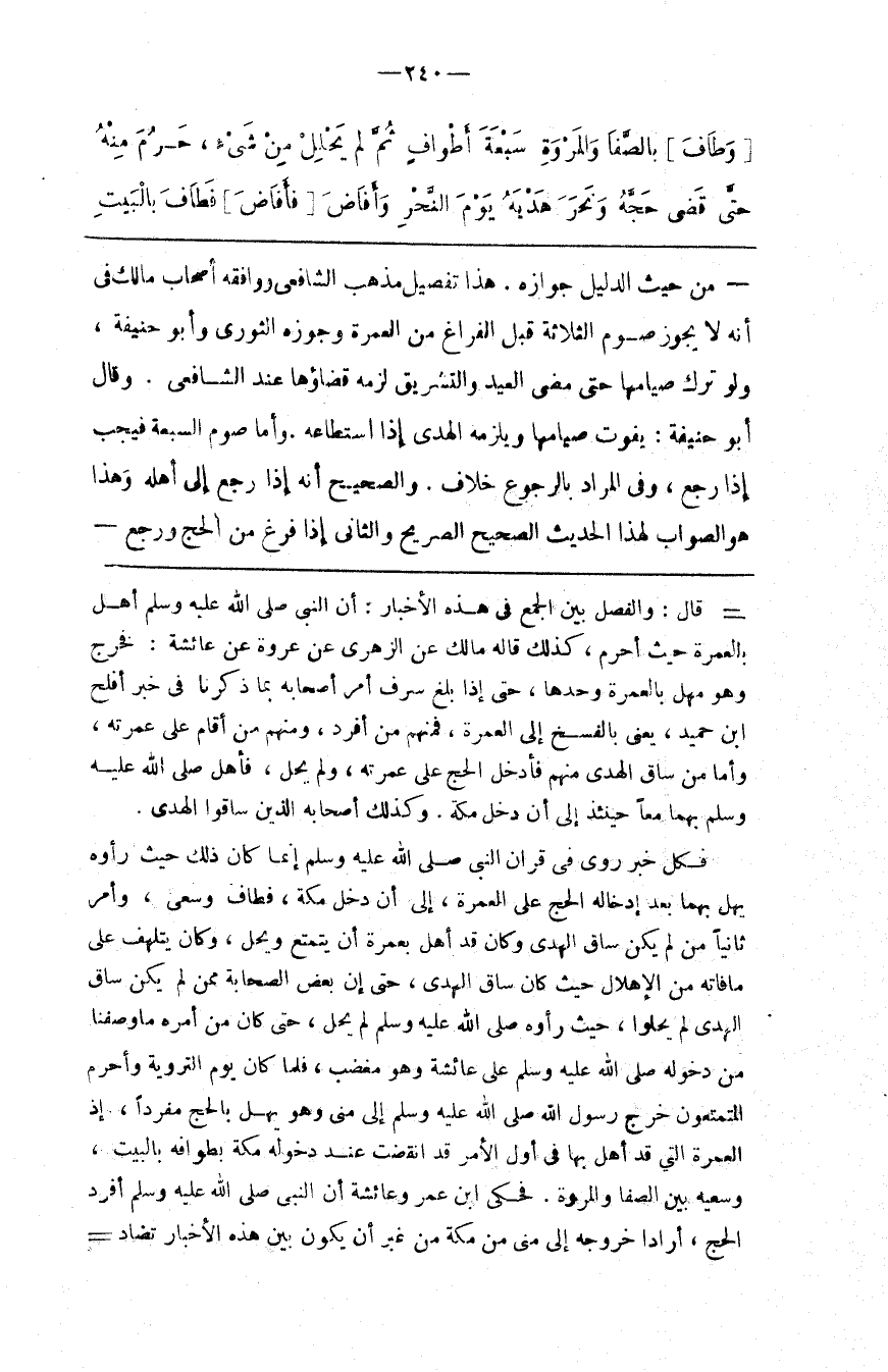 قال والفصل بين الجمع في هذه الأخبار أن النبي صلى الله عليه و سلم أهل بالعمرة حيث أحرم كذلك قاله مالك عن الزهري عن عروة عن عائشة فخرج وهو مهل بالعمرة وحدها حتى إذا بلغ سرف أمر أصحابه بما ذكرنا في خبر أفلح بن حميد يعني بالفسخ إلى العمرة فمنهم من أفرد ومنهم من أقام على عمرته وأما من ساق الهدي منهم فأدخل الحج على عمرته ولم يحل فأهل صلى الله عليه و سلم بهما معا حينئذ إلى أن دخل مكة