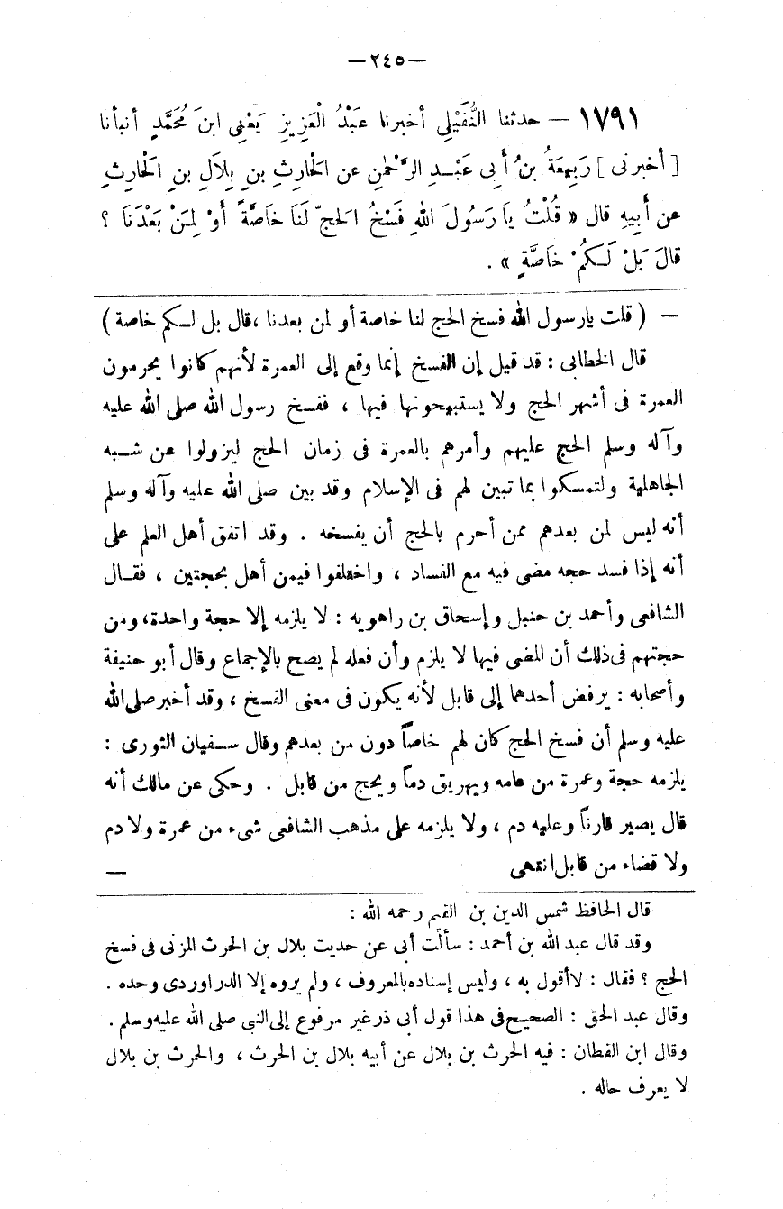 قال الحافظ شمس الدين بن القيم رحمه الله وقد قال عبد الله بن أحمد سألت أبي عن حديث بلال بن الحرث المزني في فسخ الحج فقال لا أقول به وليس إسناده بالمعروف ولم يروه إلا الدراوردي وحده