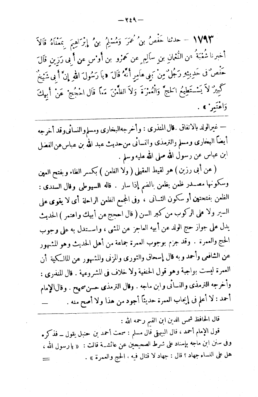 قال الحافظ شمس الدين بن القيم رحمه الله قول الإمام أحمد قال البيهقي قال مسلم سمعت أحمد بن حنبل يقول فذكره وفي سنن ابن ماجه بإسناد على شرط الصحيحين عن عائشة قالت يارسول الله هل على النساء جهاد قال جهاد لا قتال فيه الحج والعمرة