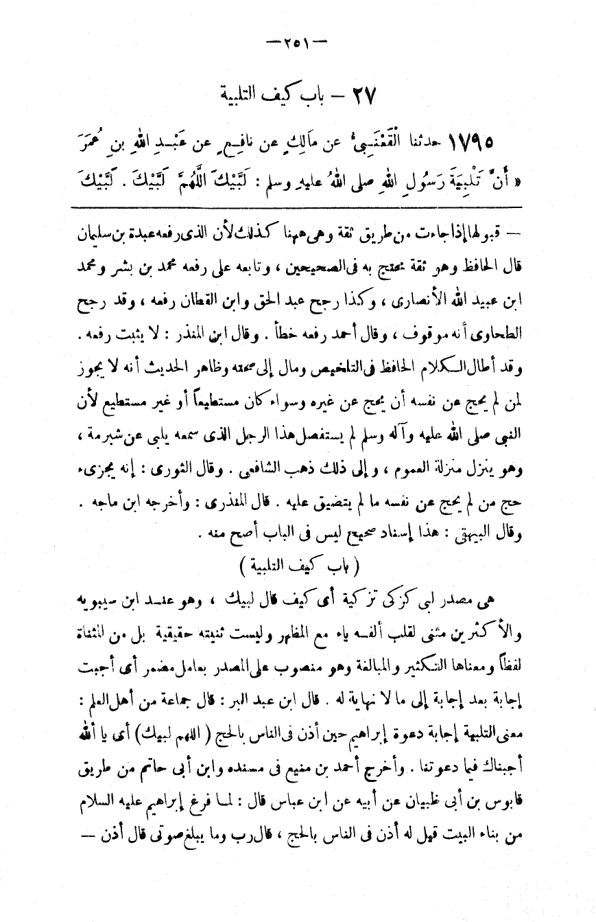 هِيَ مَصْدَر لَبَّى كَزَكَّى تَزْكِيَة أَيْ كَيْف قَالَ لَبَّيْكَ ، وَهُوَ عِنْد اِبْن سِيبَوَيْهِ وَالْأَكْثَرِينَ مُثَنَّى لِقَلْبِ أَلِفِه يَاء مَعَ الْمُظْهَر وَلَيْسَتْ ثَنِيَّته حَقِيقَة بَلْ مِنْ الْمُثَنَّاة لَفْظًا وَمَعْنَاهَا التَّكْثِير وَالْمُبَالَغَة وَهُوَ مَنْصُوب عَلَى الْمَصْدَر بِعَامِلٍ مُضْمَر أَيْ أَجَبْت إِجَابَة بَعْد إِجَابَة إِلَى مَا لَا نِهَايَة لَهُ . قَالَ اِبْن عَبْد الْبَرّ : قَالَ جَمَاعَة مِنْ أَهْل الْعِلْم : مَعْنَى التَّلْبِيَة إِجَابَة دَعْوَة إِبْرَاهِيم حِين أَذَّنَ فِي النَّاس بِالْحَجِّ .