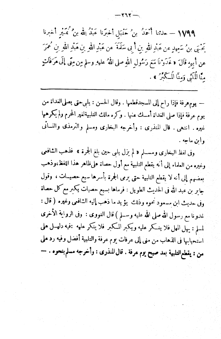 : قَالَ النَّوَوِيّ : وَفِي الرِّوَايَة الْأُخْرَى لِمُسْلِمٍ : يُهِلّ الْمُهِلّ فَلَا يُنْكَر عَلَيْهِ وَيُكَبِّر الْمُكَبِّر فَلَا يُنْكَر عَلَيْهِ : فِيهِ دَلِيل عَلَى اِسْتِحْبَابهَا فِي الذَّهَاب مِنْ مِنًى إِلَى عَرَفَات يَوْم عَرَفَة وَالتَّلْبِيَة أَفْضَل وَفِيهِ رَدّ عَلَى مَنْ : يَقْطَع التَّلْبِيَة بَعْد صُبْح يَوْم عَرَفَة .